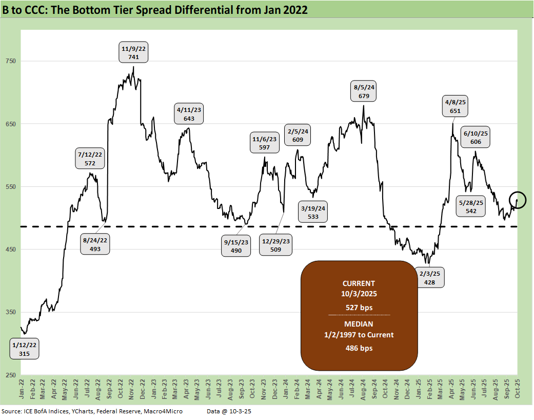 The above chart just shortens up the time horizon for the B vs. CCC quality spread differential history for the period from Jan 2022 through current times to capture the tightening cycle, the start of easing, and the new world of tariffs.