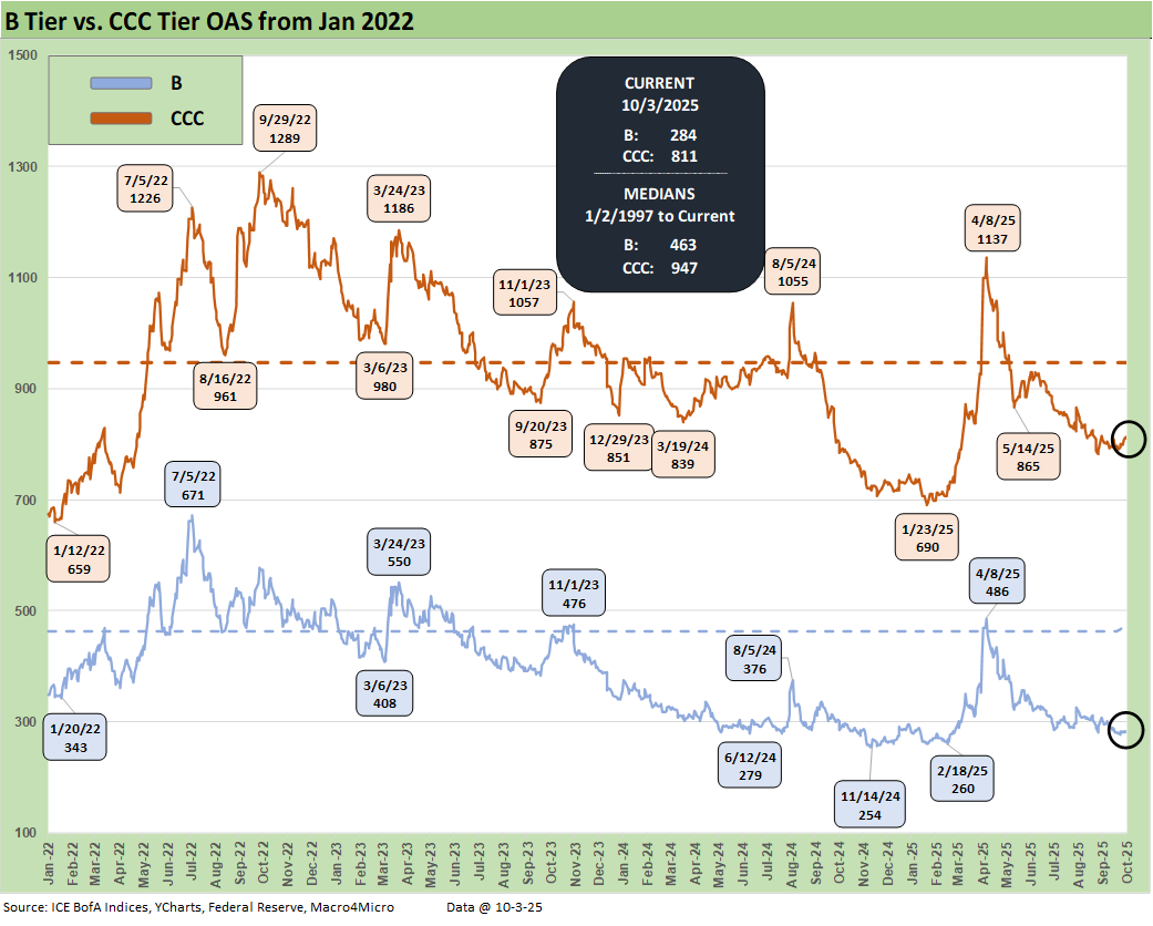 We see the current level at +284 bps back inside the +300 bps line. B tier OAS had reached a post-2007 low of +254 bps in Nov 2024 before the Liberation Day fallout in April 2025 drove the B tier OAS to +486 bps. The long-term median stands at +463 bps.