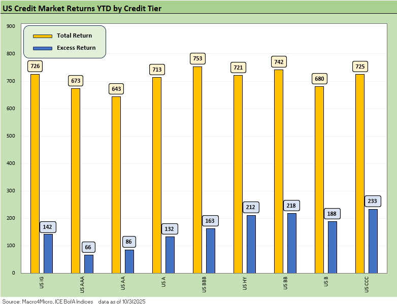 The above chart updates the YTD 2025 excess returns and total returns across IG and HY and the credit tiers. The support of the UST curve and spread compression is clearly reflected in the returns with the BB tier still the best positioned of the lot in the balance of credit risk and duration risk. The YTD excess returns were higher sequentially from last week for IG and essentially flat for HY.