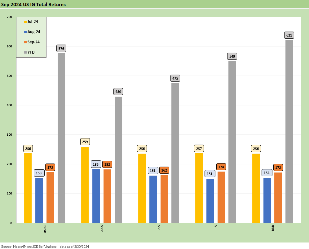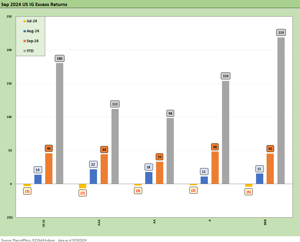 We look at total returns and excess returns across the 3Q24 period for each month in a period that gave the YTD return profile renewed strength as duration got back on track after a very strong end to 2023 in both duration and spreads gave hope for better times.