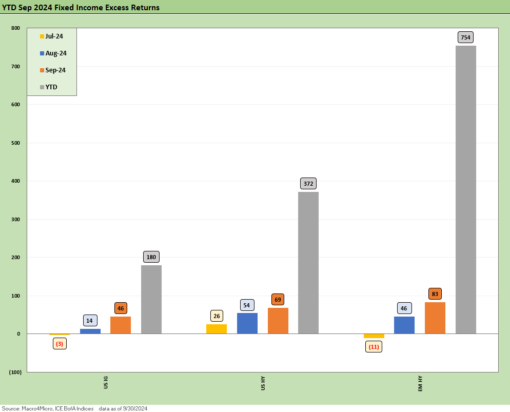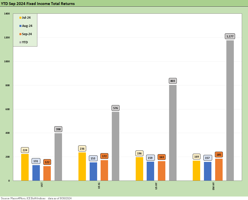 When it comes to fixed income returns from the UST asset class, across IG and then down into the riskier credit tiers of HY and EM, the period through the end of Sept 2024 came up strong. The recurring debates around soft landings, contraction scenarios, and a wave of evolving risk factors are still in play around tariffs, mass deportations side effects, and such offshore issues as geopolitics (read “war”) and China tension (Taiwan) beyond those risks we see on the screen today in the Middle East.