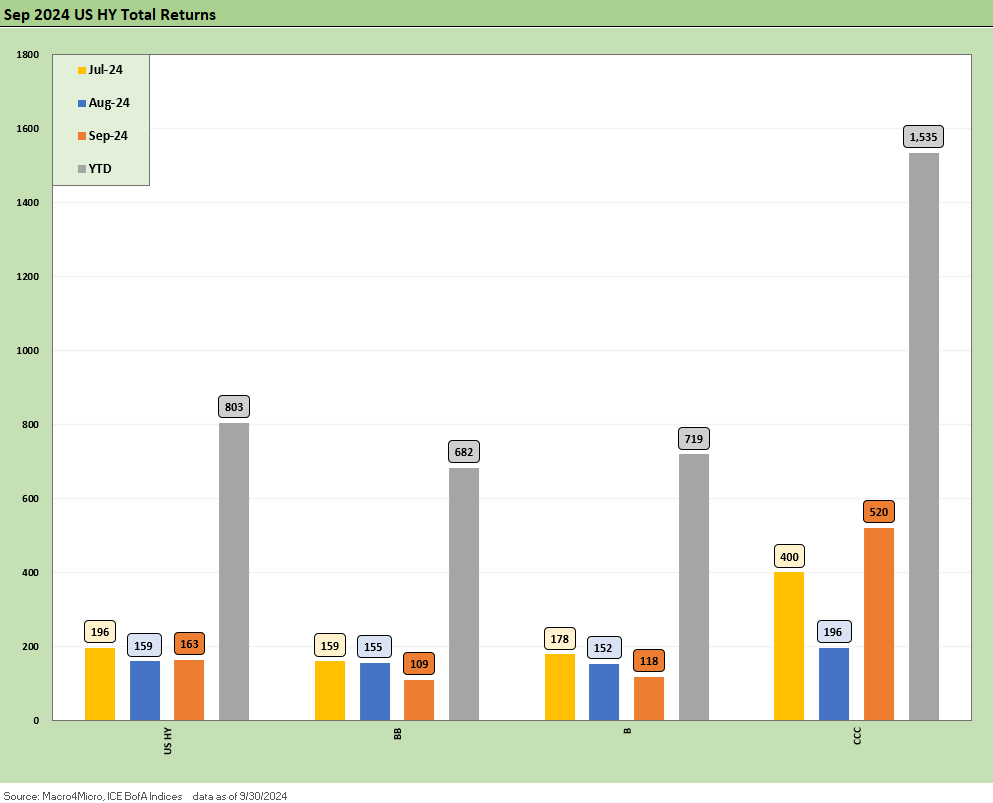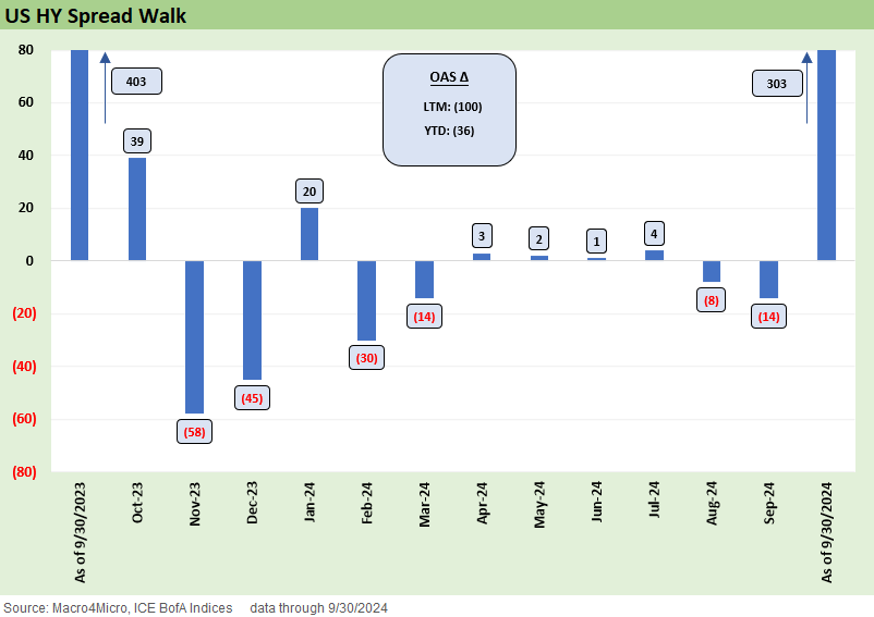 The above chart looks back across the trailing 1 year by month. We saw consistent good news or “no news” along the way with a very impressive rally in 4Q23 including -103 bps of tightening in Nov-Dec 2023. That set the stage for a mixed start in 2024 that stepped up the pace in 3Q24 as FOMC optimism setting the stage for what is likely to be a wild finish with election noise and some geopolitics that could go in any direction from here. Through 9 months, the -36 bps of HY OAS tightening is respectable with the UST curve finally kicking in with some duration support later in the year.