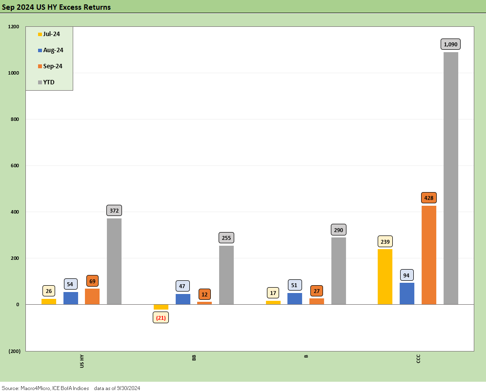 We see what a major winner the CCC tier has been in this market even if those 10 points (points, not bps!) of excess returns come with a lot of constituent idiosyncrasies, CCC tier drop-ins and drop-outs, and distressed exchanges. Those moving parts can distort the spread deltas, but the main takeaway is that all the credit tiers have been solid performers in the speculative grade range (see Footnotes & Flashbacks: Credit Markets 9-30-24).