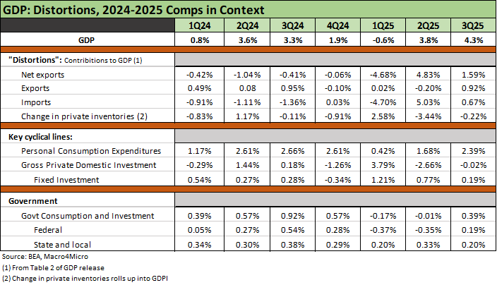 As we await the final annual numbers for 2025 (and 4Q25), it is important to consider the unprecedented adjustments that were driven by volatile swings in Net Export deltas and how that ties into inventory changes. We discussed those topics at length in earlier commentaries and some of our recent LinkedIn posts (see 3Q25 GDP: Morning After Variables to Ponder 12-27-25).