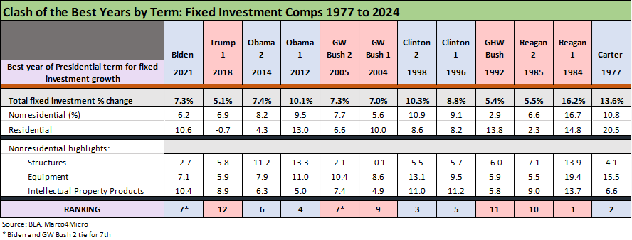 We reproduce some of the historical economic growth tables in this note with a new one looking at the best Fixed Investment performance years for each President from Carter to Biden. The best fixed asset growth year from Trump 1.0 was 2018, which is in last place among the other “best of” years. He was also dead last in Residential investment that year vs. presidential peers.