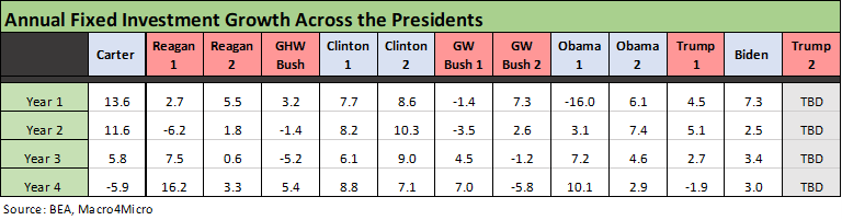In the above table, we take the best Fixed Investment growth rate year from each Presidential administration. In this case, we use the most recent annual term available (Biden) and use a chronological order from most recent on the left back to Carter on the right. We await the 4Q25 and annual numbers for Trump 2.