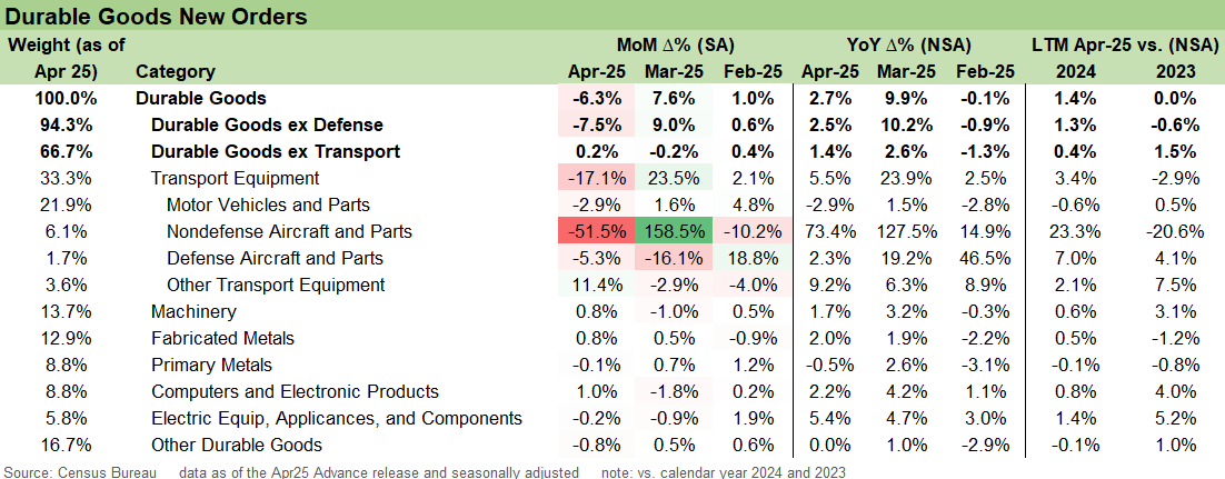 - Headline durable goods declined -6.3% in April as Nondefense Aircraft and Parts orders fell -51.5%. This is the largest drop since January 2024 which saw a similar collapse in aircraft order volumes.