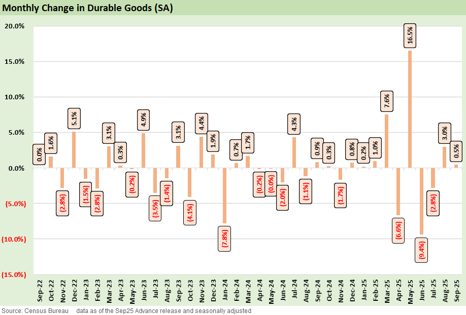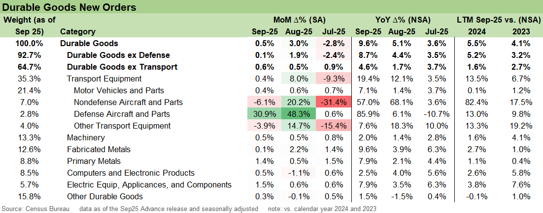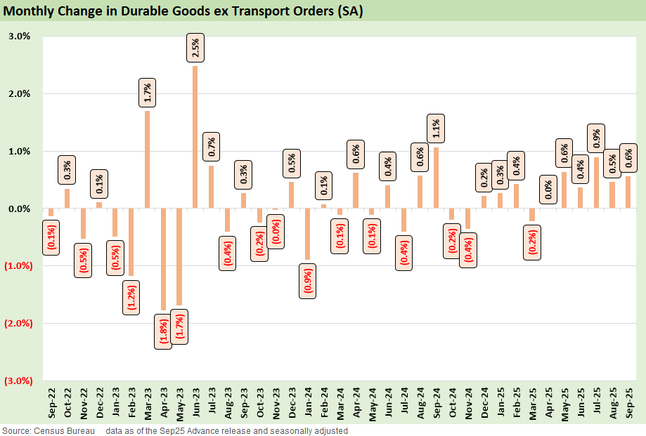 We delve into the underlying details for September with both the ex-Defense and ex-Transport cuts included. Transport Equipment saw a +0.4% MoM swing this month after a very volatile few months. Within that, motor vehicles and parts were up 0.4% MoM, extending a steady run of small positive prints despite tariff and margin pressure in autos.