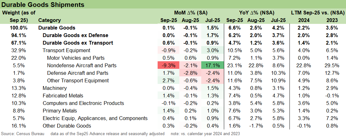 The above covers shipments, which provide a cleaner link to near-term GDP and revenue. Total durable goods shipments increased 0.1% MoM in September. Ex-transport shipments were stronger at 0.6% MoM. Within transport, shipments fell 0.9% MoM, driven by a 9.3% MoM drop in nondefense aircraft after a very strong August, partially offset by gains in defense aircraft and other transport equipment.