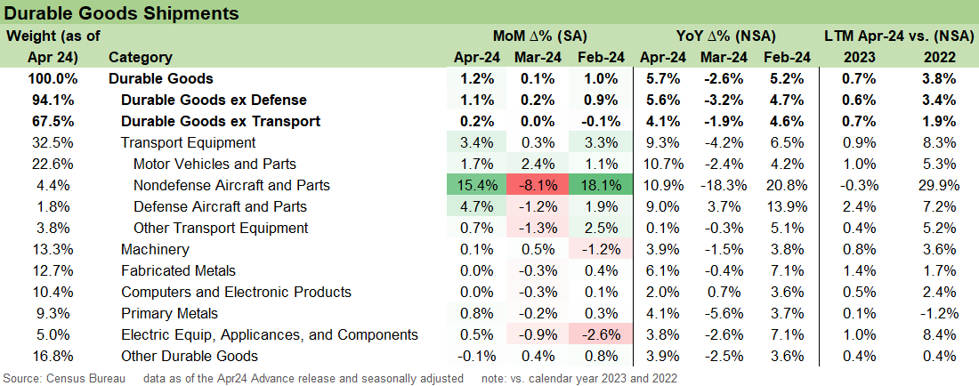 Durable Goods ex Transport is positive news for manufacturing demand at .4% MoM seasonally adjusted, which is up 4.5% vs. Apr 2023 on a not seasonally adjusted basis. Within that transport grouping, Nondefense Aircraft and Parts is back to a decidedly negative month at -8.0% where much of the Boeing saga continues to play out.