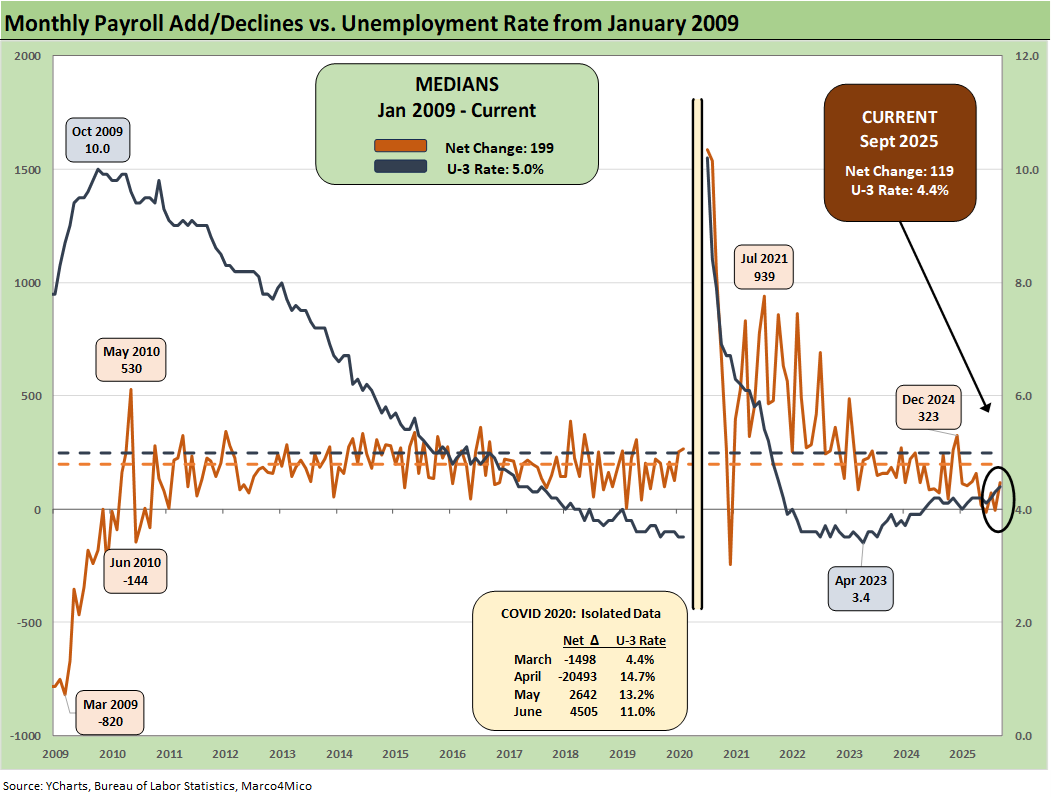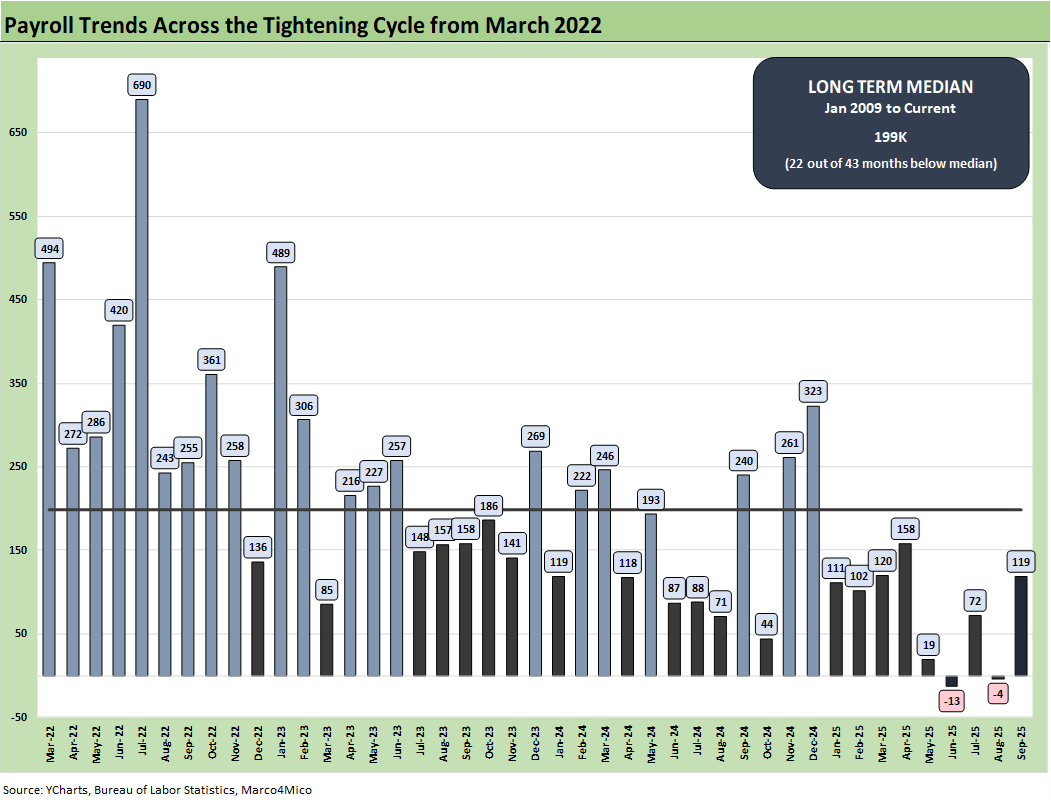 The headline Sept payroll adds of +119K ease some bearish signals of late. The belated payroll release brings us closer to more inputs on how the consumer and the cycle are faring, but 4Q25 data is the real story after such mixed results including two negative months.
