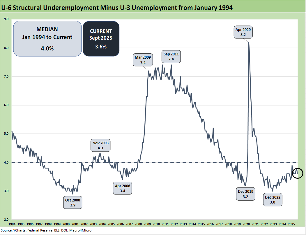 The above chart updates the time series for the U-3 unemployment rate and U-6 structural underemployment rate across the years from 1994. The current U-3 rate ticked higher to +4.4% in Sept. As a reminder, the U-6 metric is defined with the numerator as “total unemployed + persons marginally attached to the labor force + total employed part time for economic reasons.” The denominator is “civilian labor force + workers marginally attached to the labor force.”