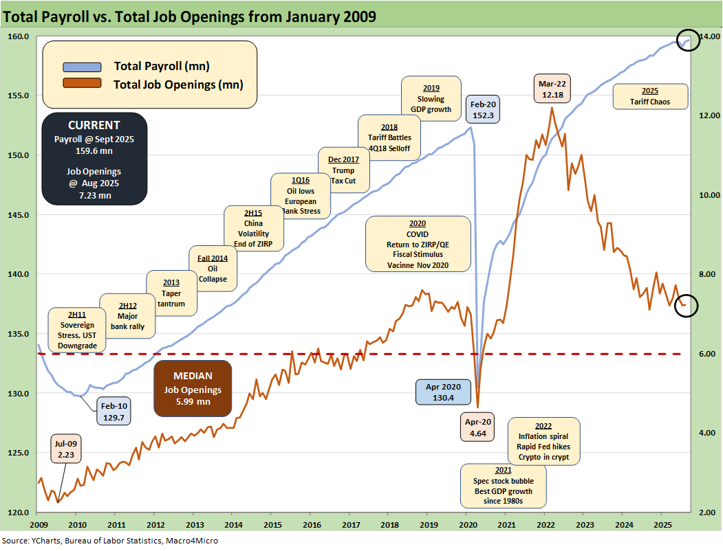 The above chart updates the total payroll number vs. job openings. The most recent JOLTS numbers have been unimpressive (JOLTS Aug 2025: Tough math when “total unemployed > job openings” see 9-30-25). We will need to wait for more timely JOLTS data.