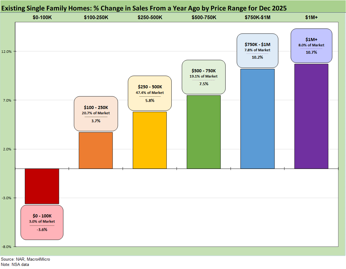 The rise in volume came alongside a small MoM decline in median prices for total existing to $405.4K, which is the lowest since March 2025. Single family prices also dipped sequentially to $409.5K, the lowest since March. The year 2025 began with single family prices at $398K in Jan 2025 after $408.5K in Dec 2024 with an asterisk for mix shifts by region and price tier.