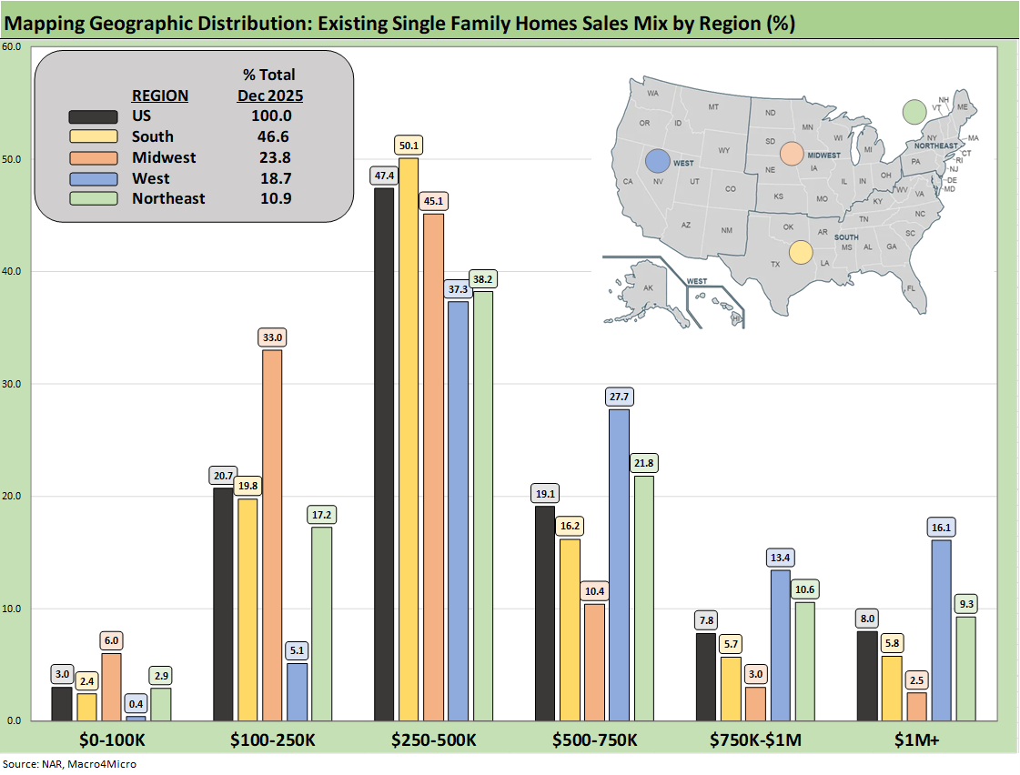 For the bar chart, we break out the mix for each region by price tier. For example, the South shows over 50% of its existing home sales volume in the $250k to $500K range and over 16% of its sales in the $500 to $750K bucket. The bars for each region add up to 100% (rounding).
