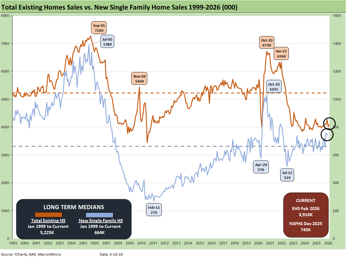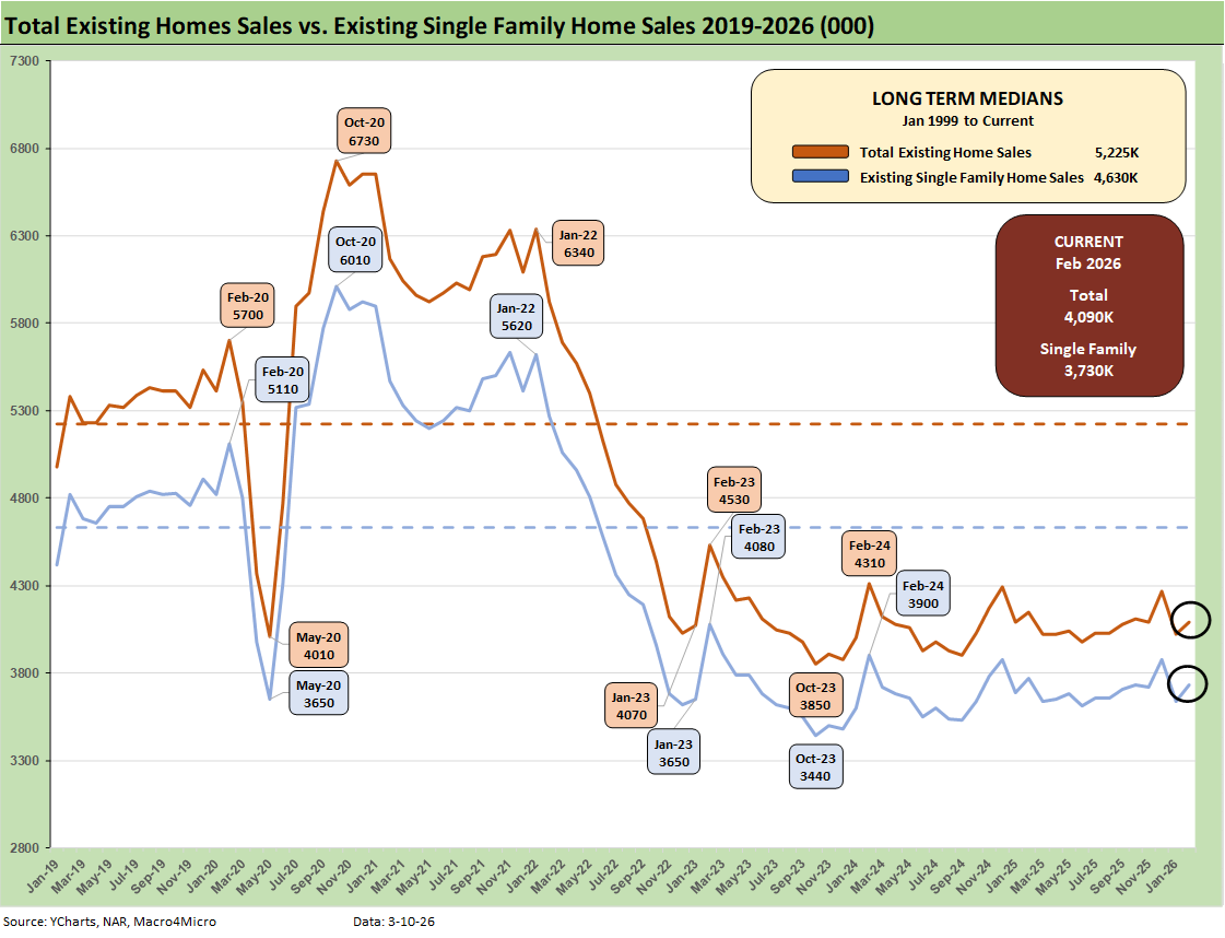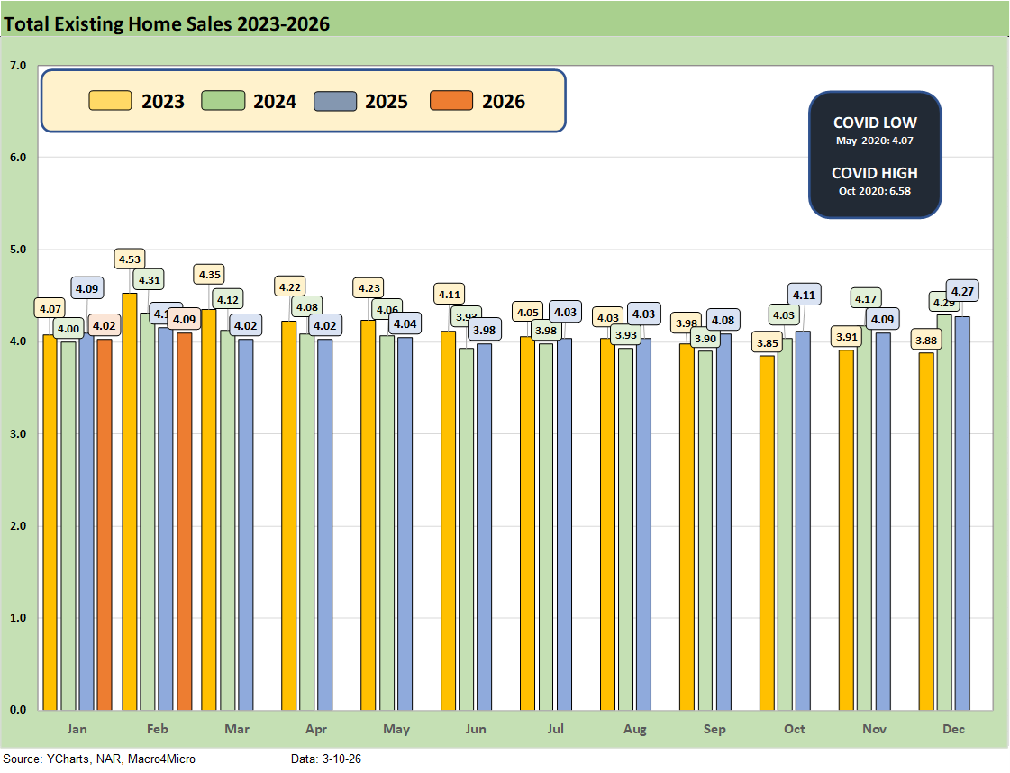 The above chart updates the monthly existing home sales across the timeline from Jan 2023 through Jan 2026. In the interest of visual quality, we had to delete the 2022 months when the market was posting 6 million and 5 million handle sales volumes in the first half of that year.