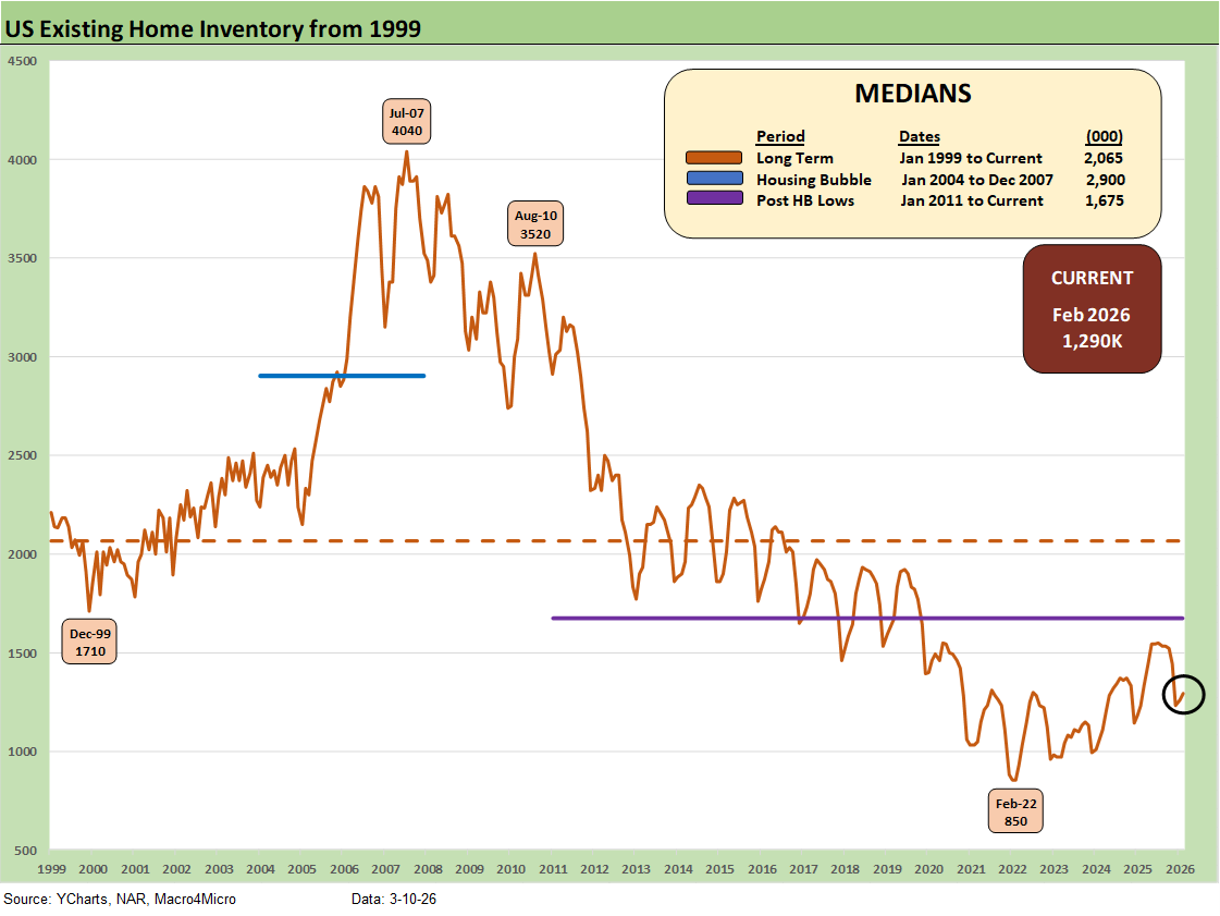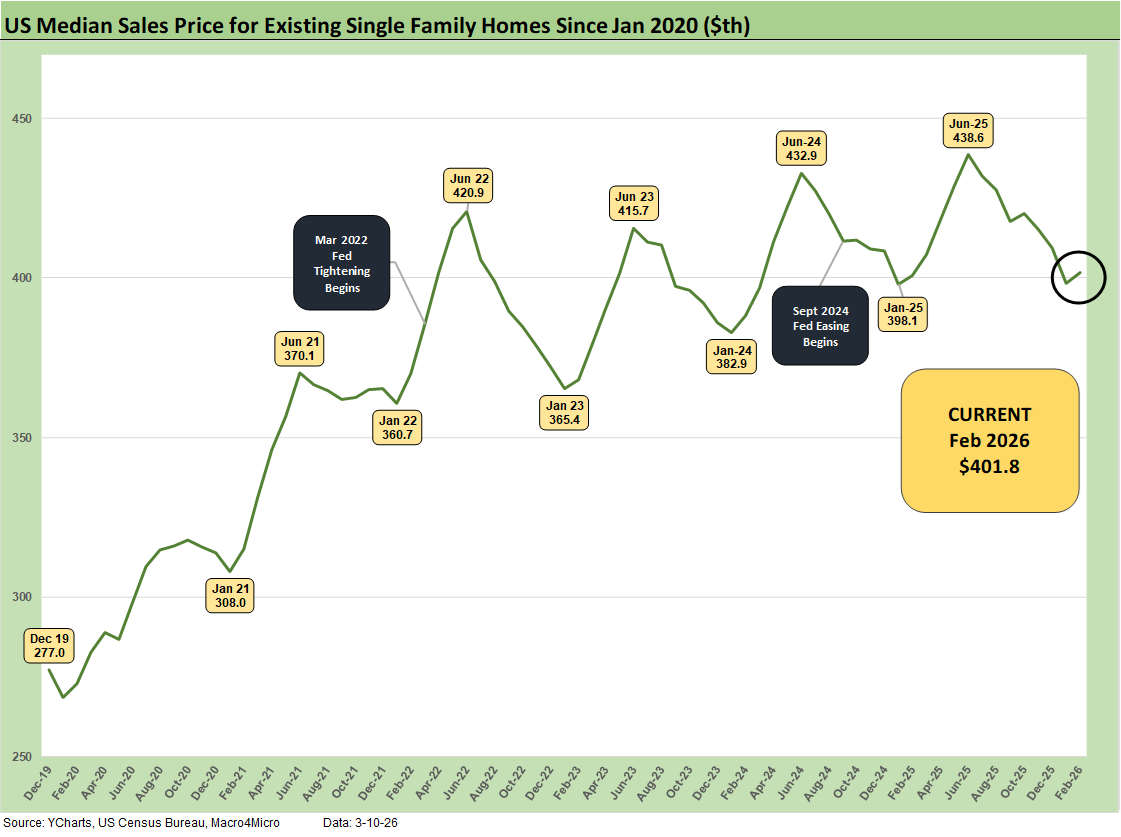 The above chart updates the median price for existing single-family homes at $401.8K after June 2025 hit a record $438.6K. The median price in Feb 2026 is dramatically above the $308K level back in Jan 2021 and $277K in Dec 2019 when mortgage rates were in a different zip code.