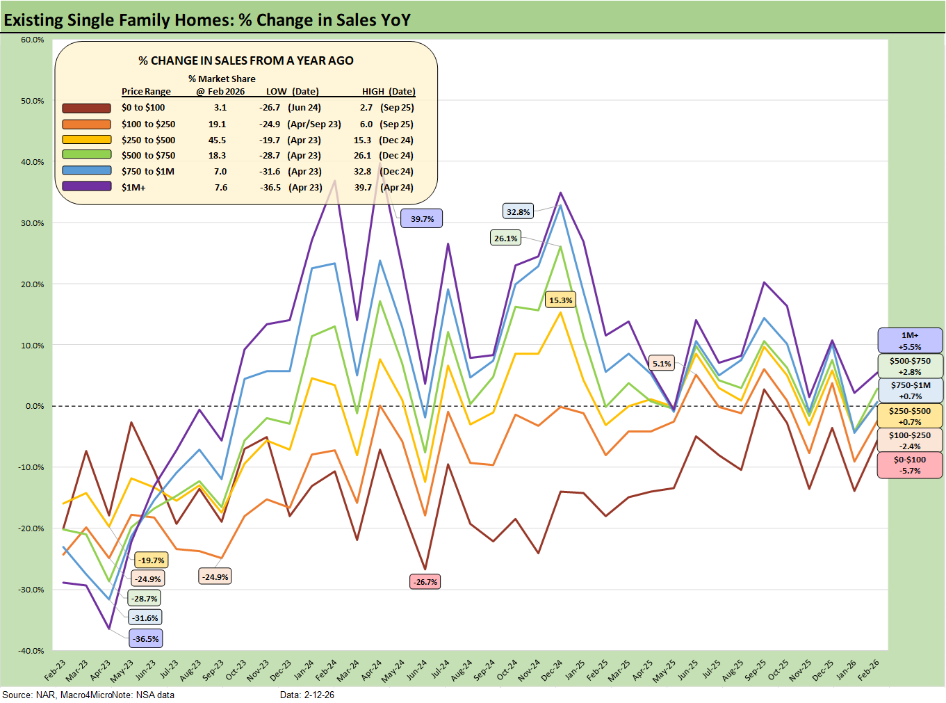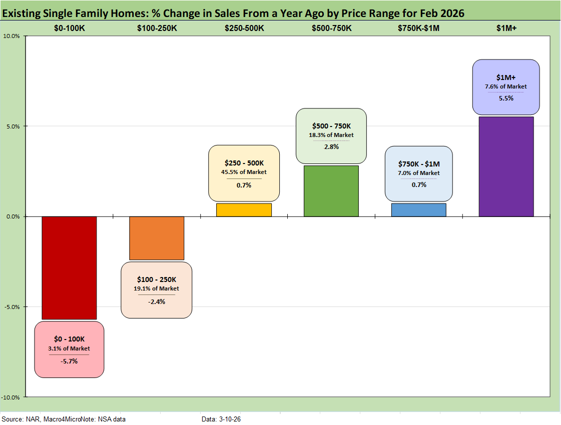 The above chart shows the sales volume delta by price tier for Feb 2026, and we see 4 of the 6 price tiers posting positive growth with only the two lowest price tiers posting declines.