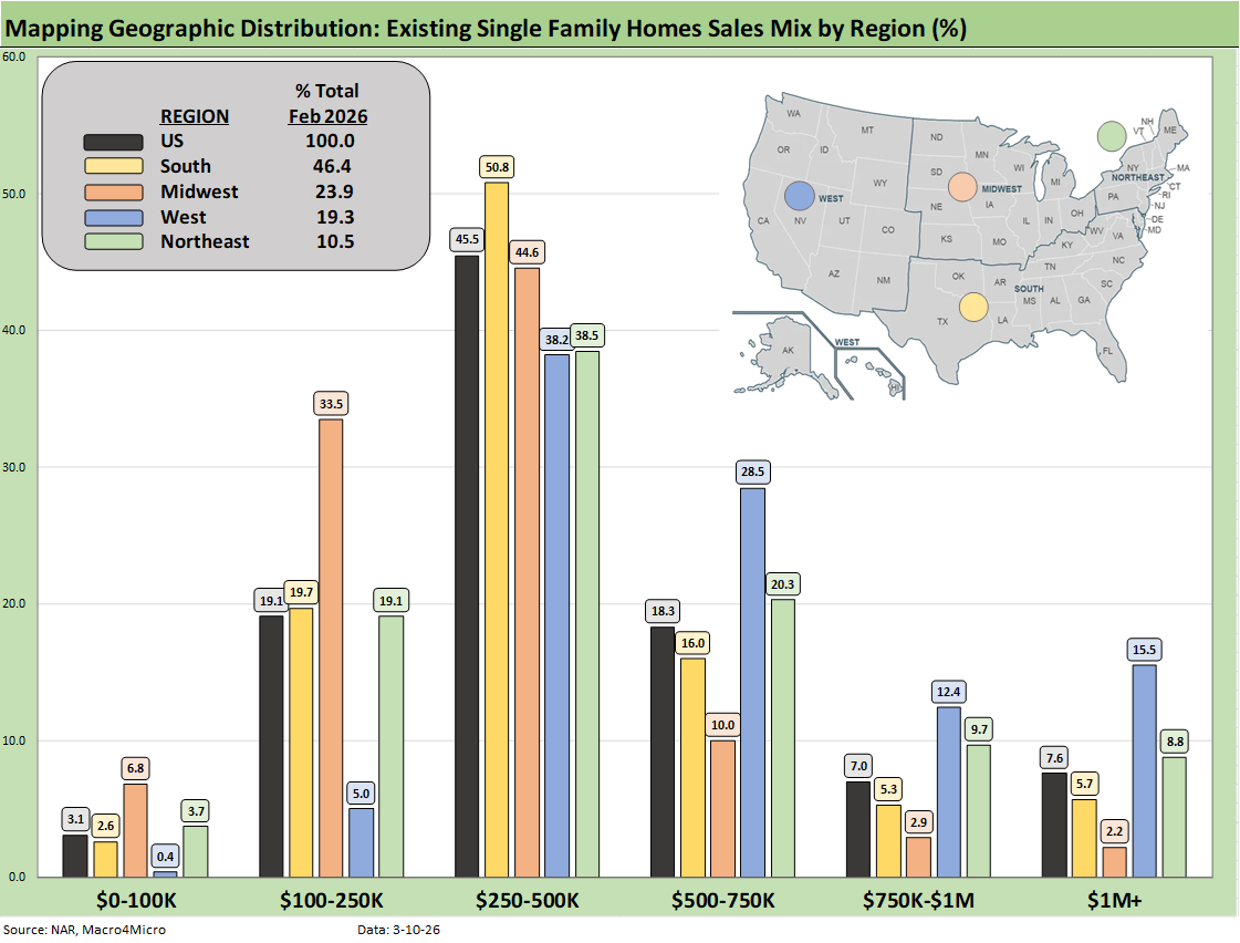 For the bar chart, we break out the mix for each region by price tier. For example, the South shows over 50% (50.8%) of its existing home sales volume in the $250k to $500K range and 16% of its sales in the $500 to $750K bucket.