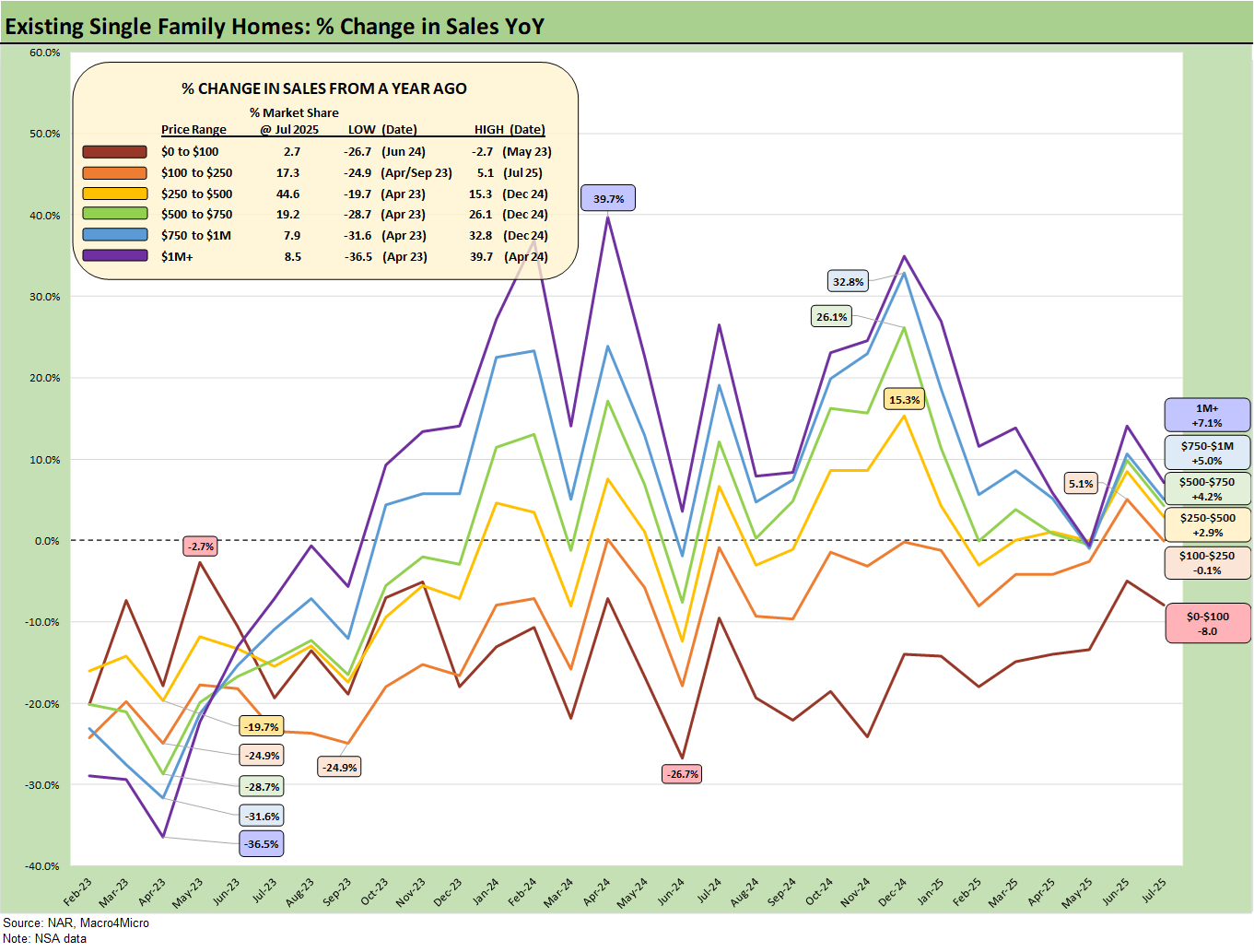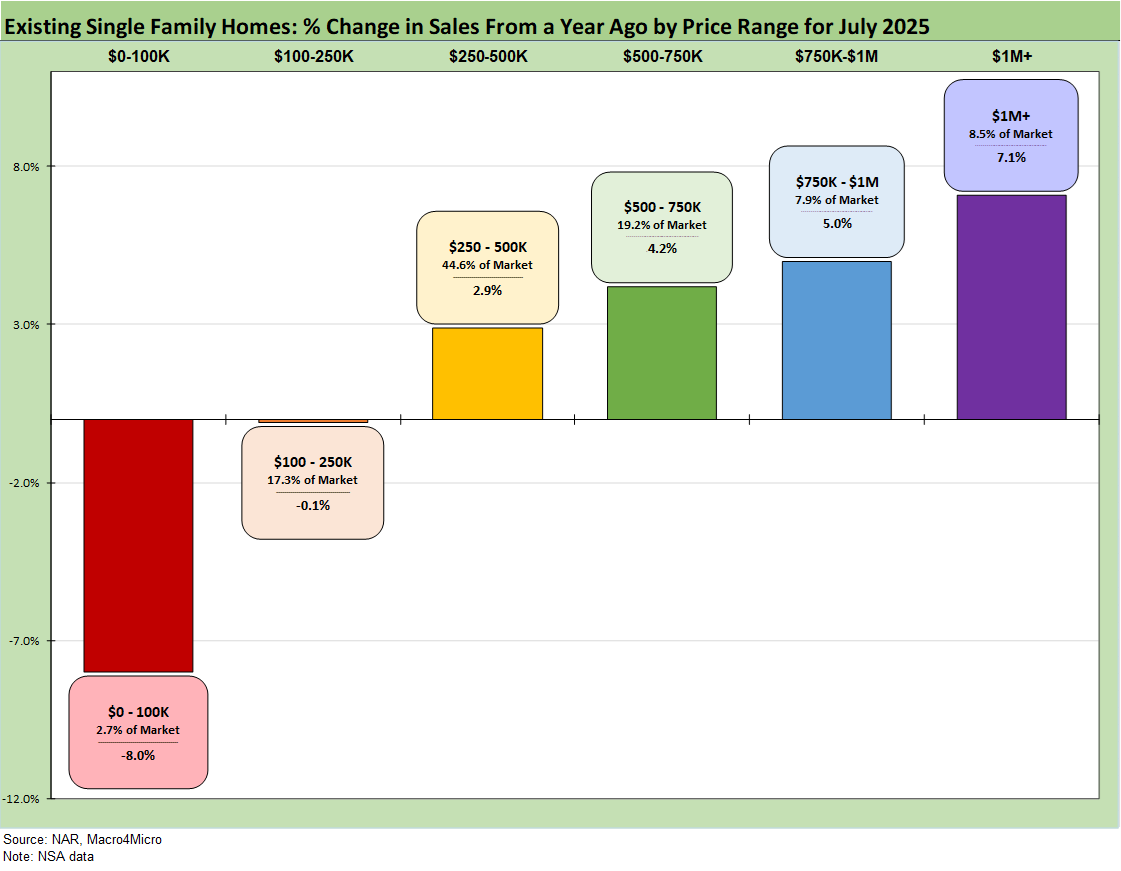 The above chart revisits the topical area addressed earlier on the existing home sales deltas by price tier. The largest tier is the $250K to $500K at over 44% of sales volumes, and that tier was only at +2.9% in a month that is in the peak selling season.