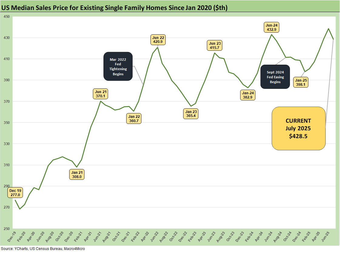 The above chart updates the median price for existing single-family homes at $428.5 K after June 2025 hit a record $438.6K and trumped the June 2024 $432.9K. The median price in July 2025 is dramatically above the $308K level back in Jan 2021 and $277K in Dec 2019 when mortgage rates were in a different zip code.