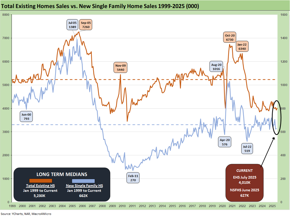 The equity market confidence in better housing news ahead has been evident in the performance of the Homebuilder ETF (XHB) and the major builders (see Footnotes & Flashbacks: Asset Returns 8-16-25). Whether Fed action and macro fundamentals will translate into materially higher existing sales volumes will be tied more to mortgage rates and homebuyer appetites with the cyclical question marks and consumer confidence still uncertain.