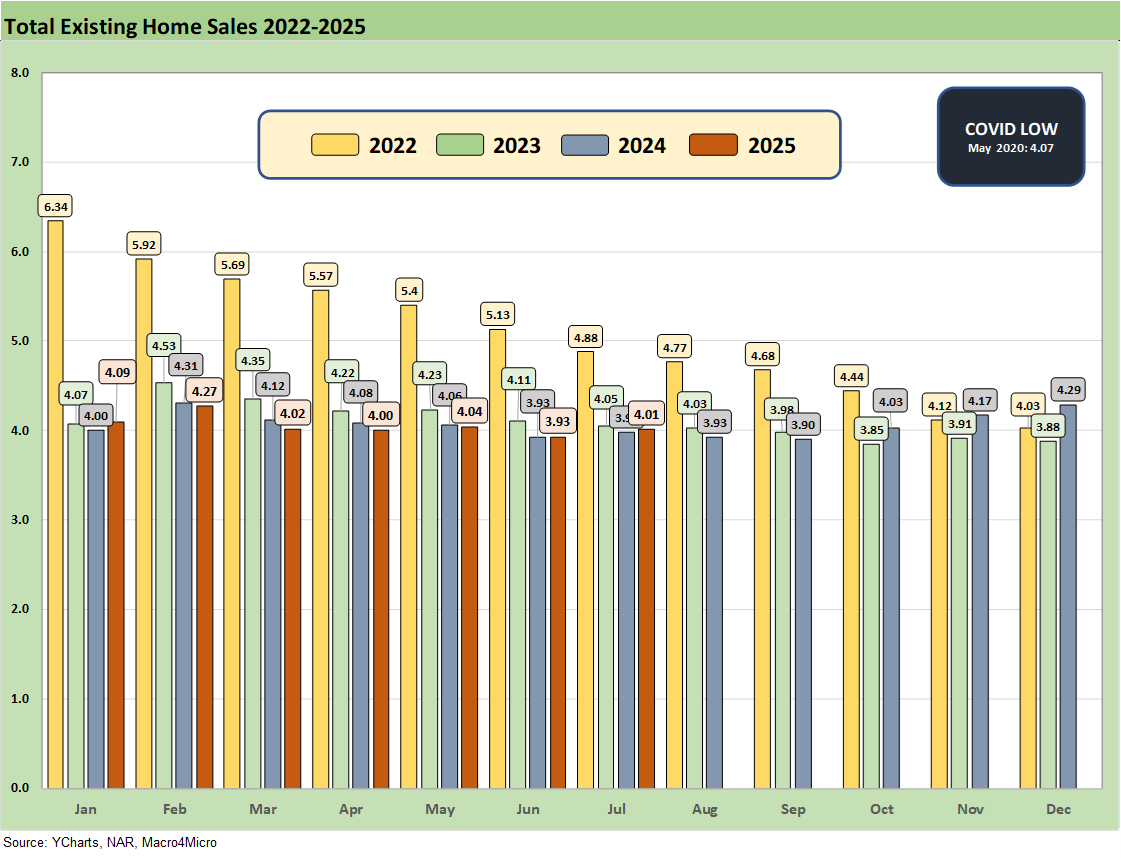 The July 2025 total of 4.01 million is below the May 2020 COVID trough of 4.07, so the current run rates remain quite low in cyclical context. We had a few more sub-4 million handles along the way as noted in the chart, so this has been a brutal period for real estate brokers.