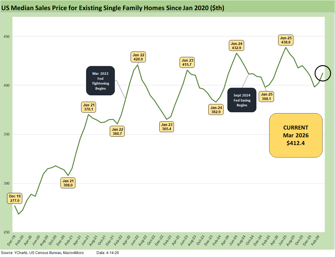The above chart updates the median price for existing single-family homes at $412.4K after June 2025 hit a record $438.6K. The median price in March 2026 is dramatically above the $308K level back in Jan 2021 and $277K in Dec 2019 when mortgage rates were in a different zip code and closer to 3.7% for 30Y Freddie Mac.