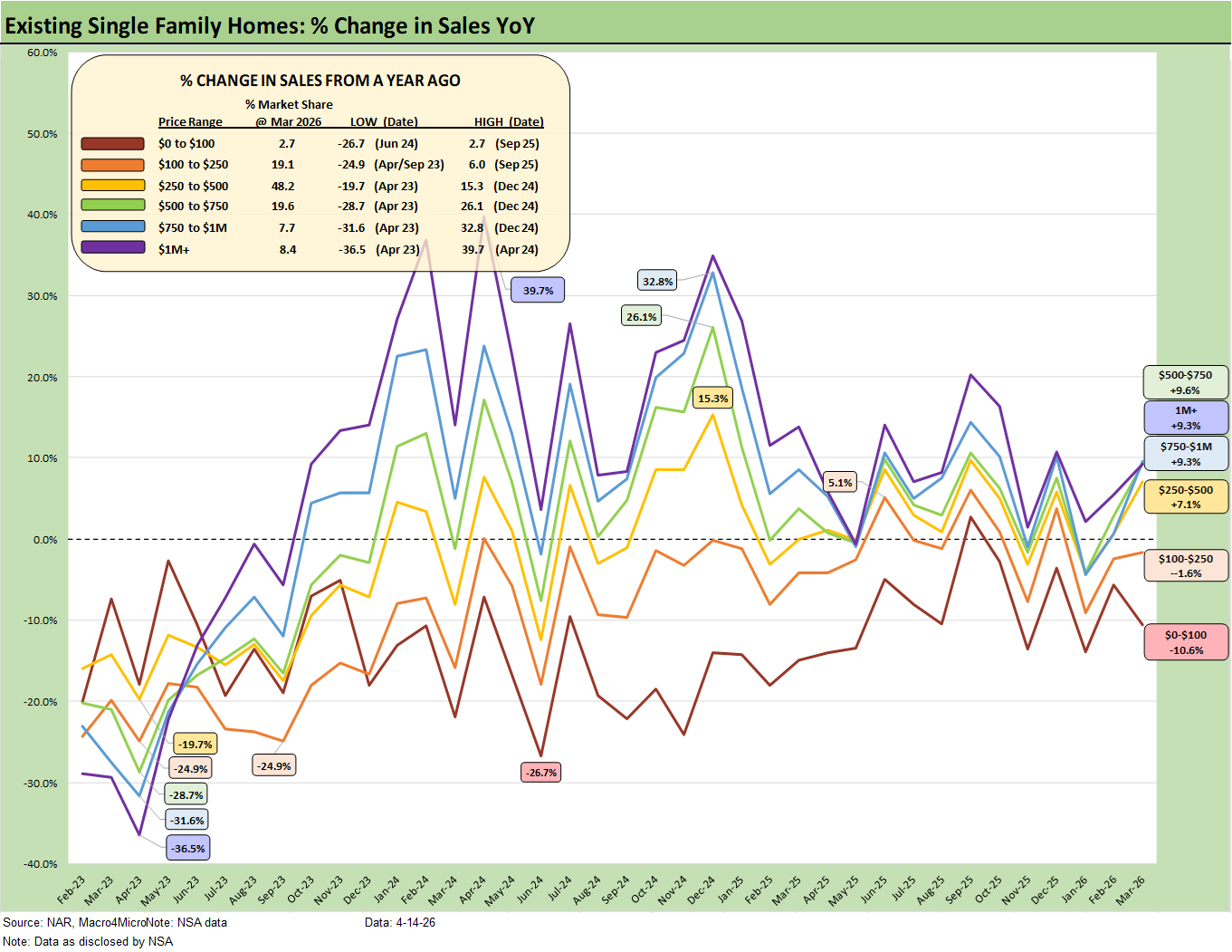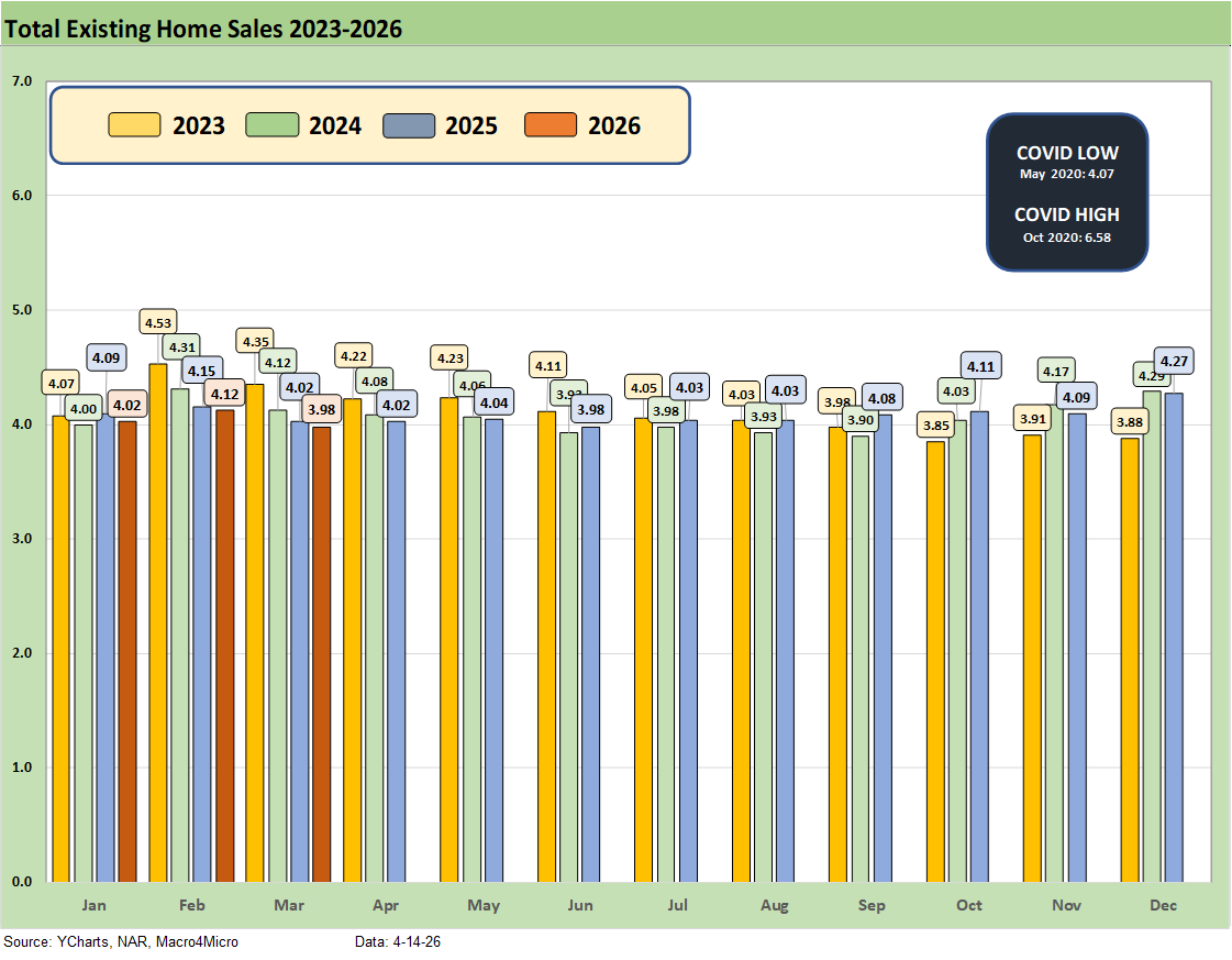 The above chart updates the monthly existing home sales volume across the timeline from Jan 2023 through March 2026. In the interest of visual quality, we deleted the 2022 months when the market was posting 6 million and 5 million handle sales volumes in the first half of that year.