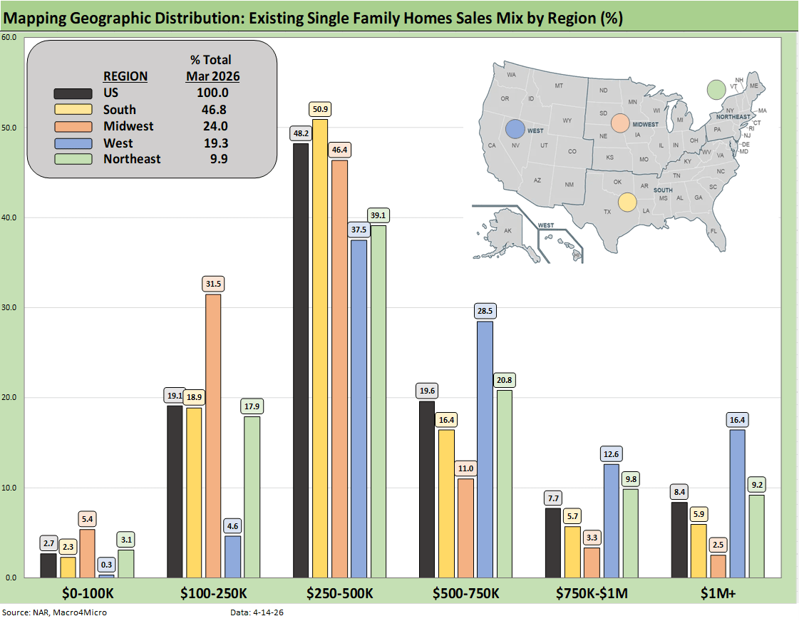 For the bar chart, we break out the mix for each region by price tier. For example, the South shows almost 51% of its existing home sales volume in the $250K to $500K range and almost 19% of its sales in the $100K to $250K bucket.