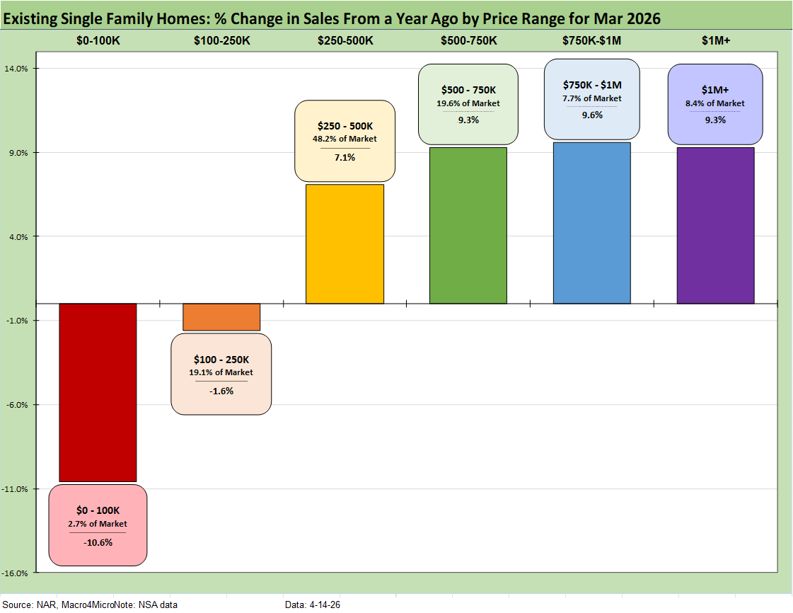 The above chart shows the sales volume delta by price tier for March 2026, and we see 4 of the 6 price tiers posting positive growth with only the two lowest price tiers posting declines. That was the same mix of deltas as last week. Note: We use “not seasonally adjusted data” for this chart so it clashes with the declines of overall sales discussed elsewhere in this commentary that use SAAR data (seasonally adjusted annual rate)