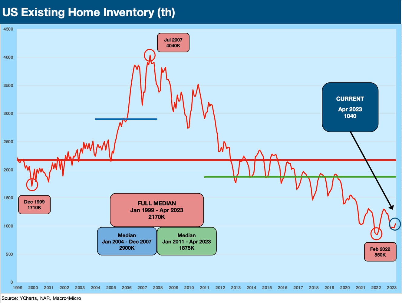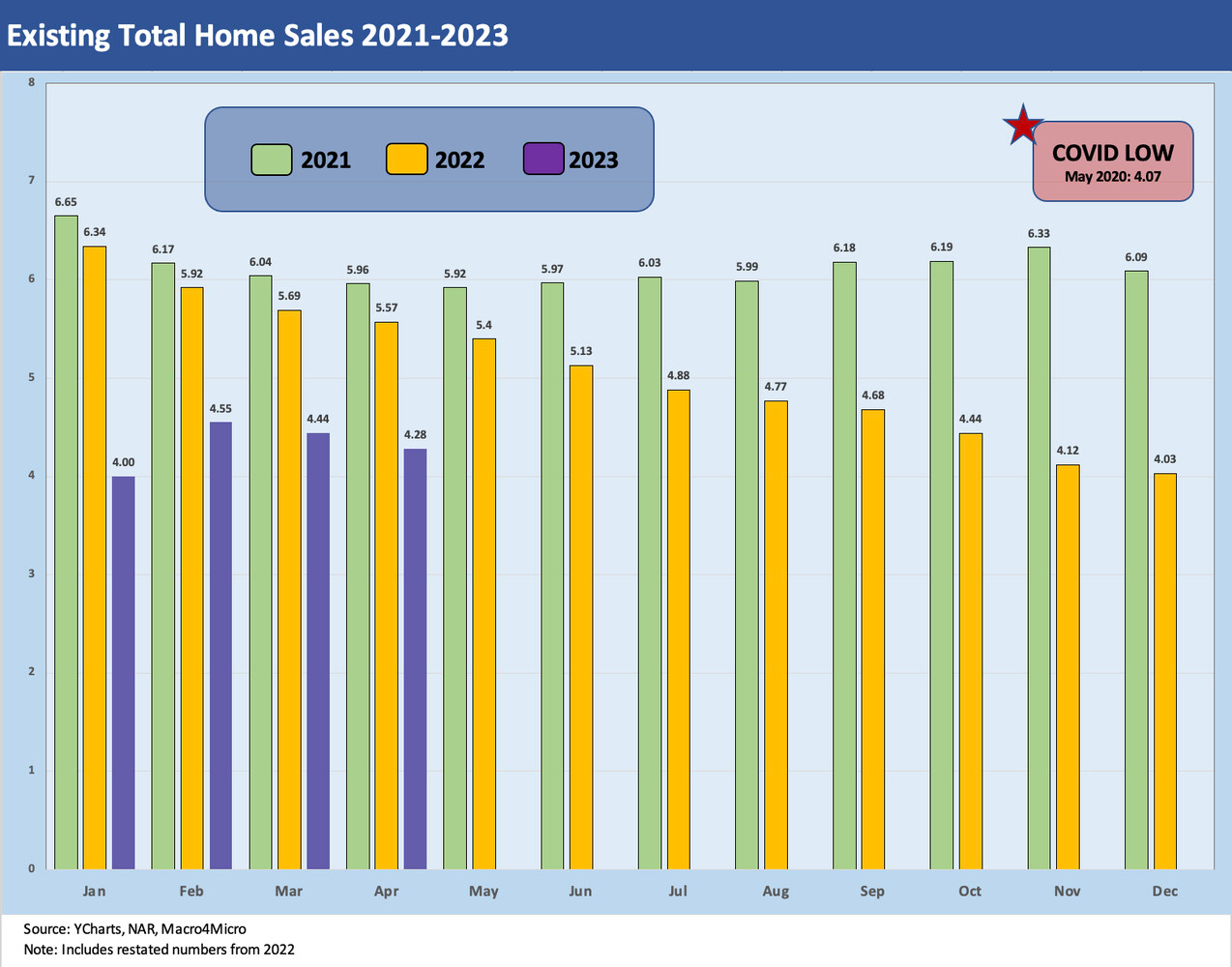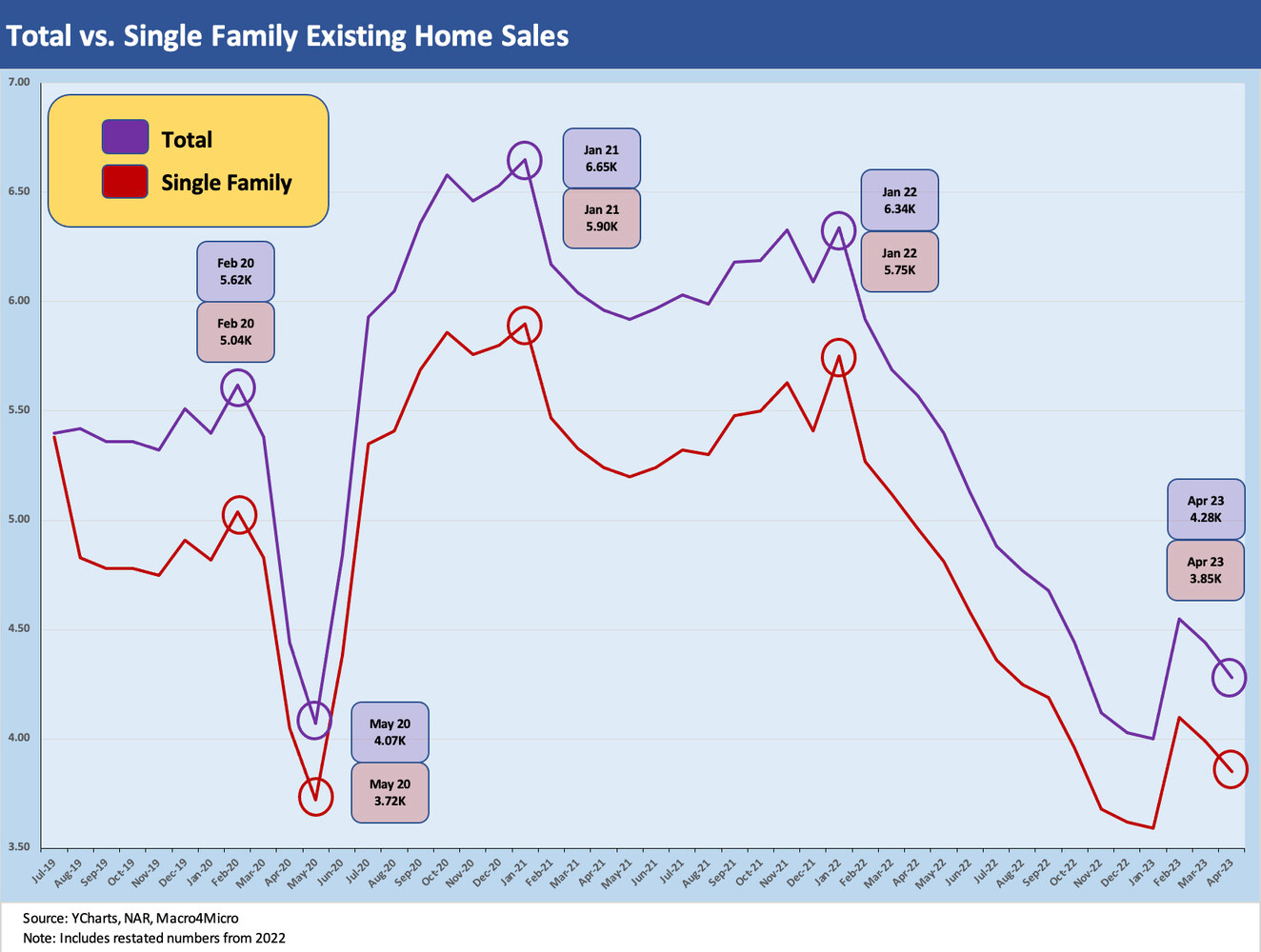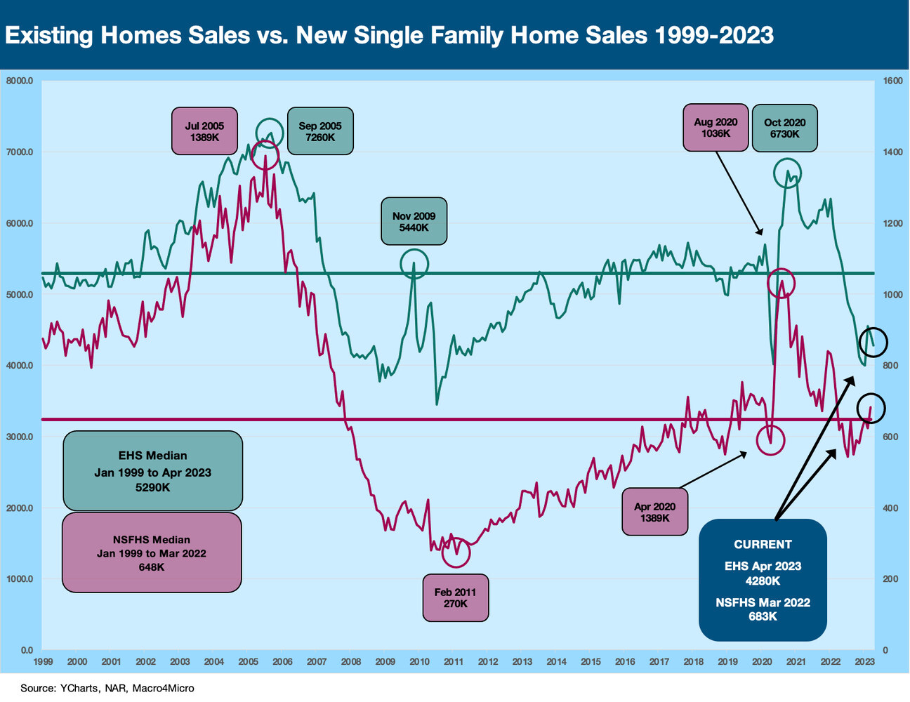 Today we got another big slice of the home supply-demand picture after the starts and permits from yesterday (see Home Starts and Permits: Performing with a Net? 5-17-23). The flavor of the language from the NAR was positive in some respects (more multiple offers, shorter time on markets, etc.) despite the objective reality of a sequential downtick in numbers.