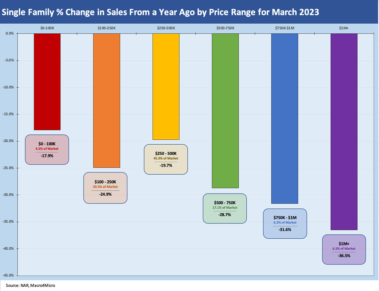 We wrap the update above with the mix of declines across the price tiers. The bar chart also flags the market share of that price segment (e.g., the $250K-$500K bracket is 43.5% of the market). We see the $1M+ segment down the most at -36.5% followed by the $750-$1M bracket at -31.6%. The sweet spot of $250-$500K is down by only -19.7%