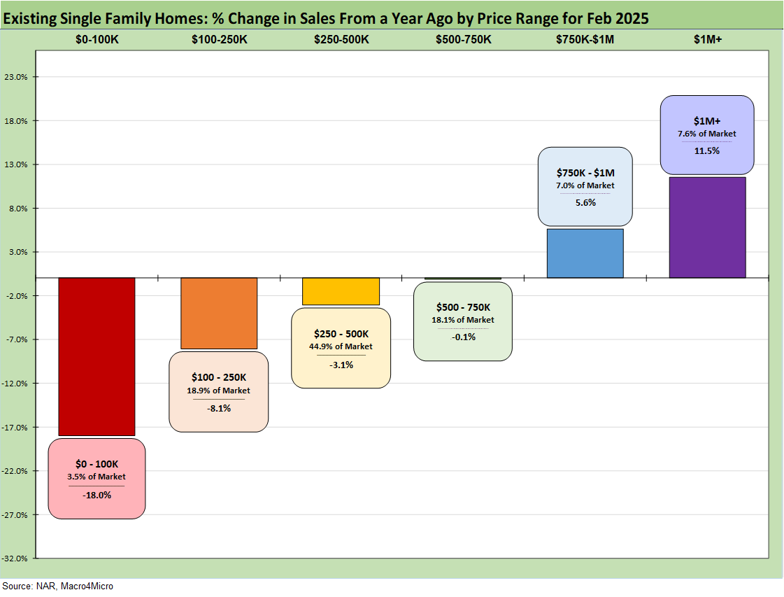 The above chart revisits the topical area addressed earlier on the existing home sales deltas by price tier. The largest tier is the $250K to $500K at almost 45% of sales volumes, and that was down by -3.1% in a setback from recent trends.