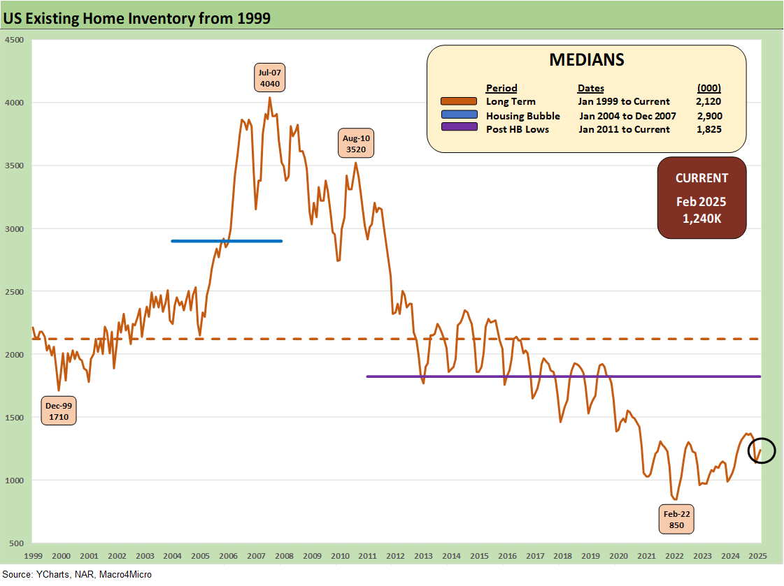 Inventory rose on the month by +5.1% sequentially to 1.24 million for total existing homes. The existing home inventory trend is back to climbing off the lows of 2022-2023. Inventory has risen into the 1.3 million handle range in 2024 before dipping back down to a recent low of 1.14 million to close out 2024. We see the Feb 2022 lows at 850K above when demand was very high just before the tightening cycle kicked into gear in March 2022. Separately, single family home inventory is up by +17.2% YoY and +5.8% sequentially.