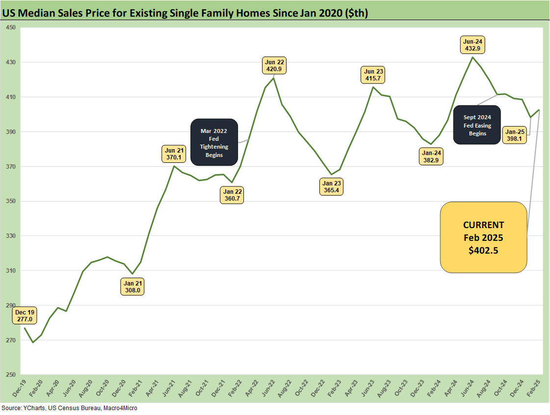 The above chart updates the median price for existing single family homes at $402.5K. Though down from the June 2024 high of $432.9K, the median price remains well above the $308K back in Jan 2021 and $277K in Dec 2019 when mortgage rates were in a different zip code.