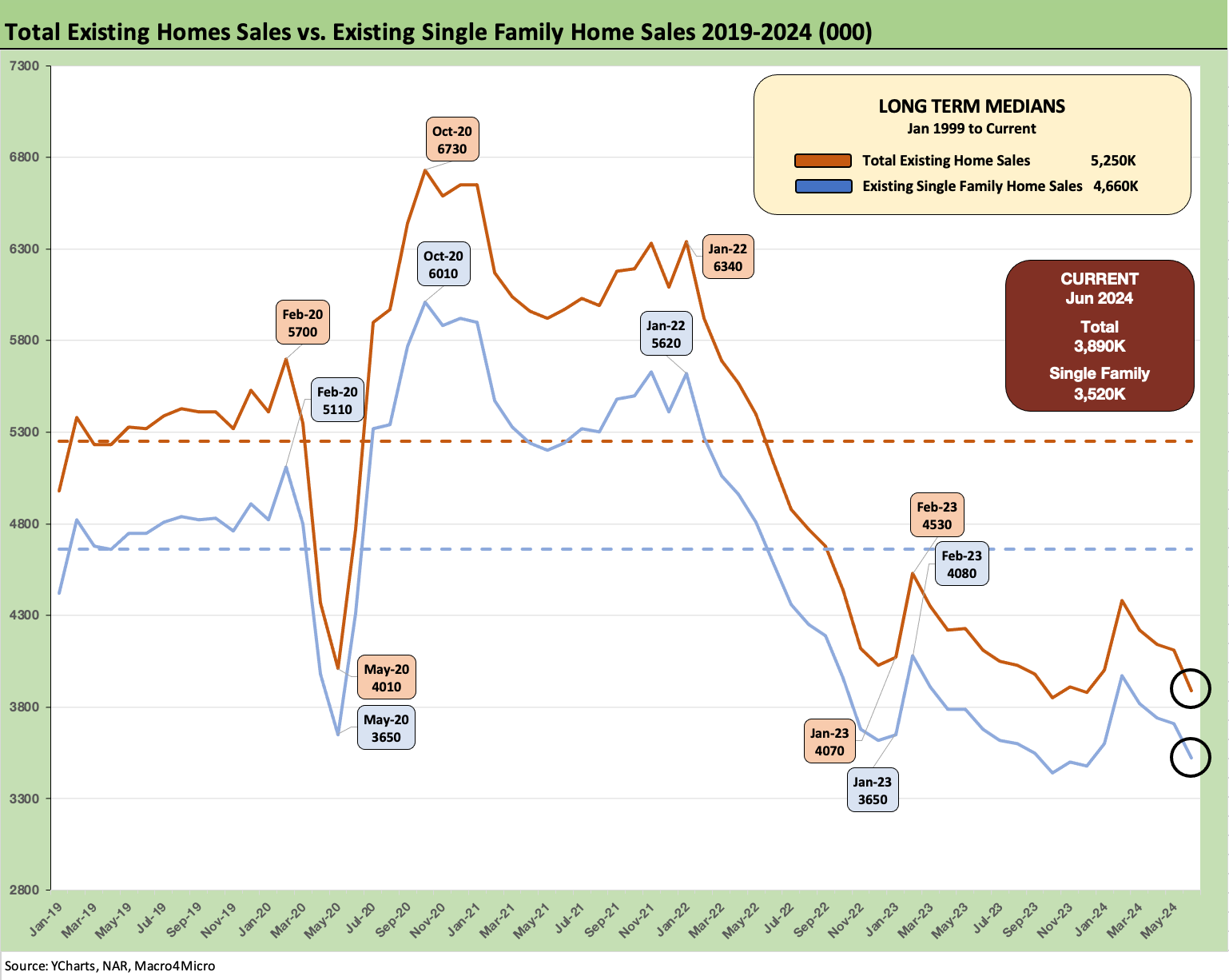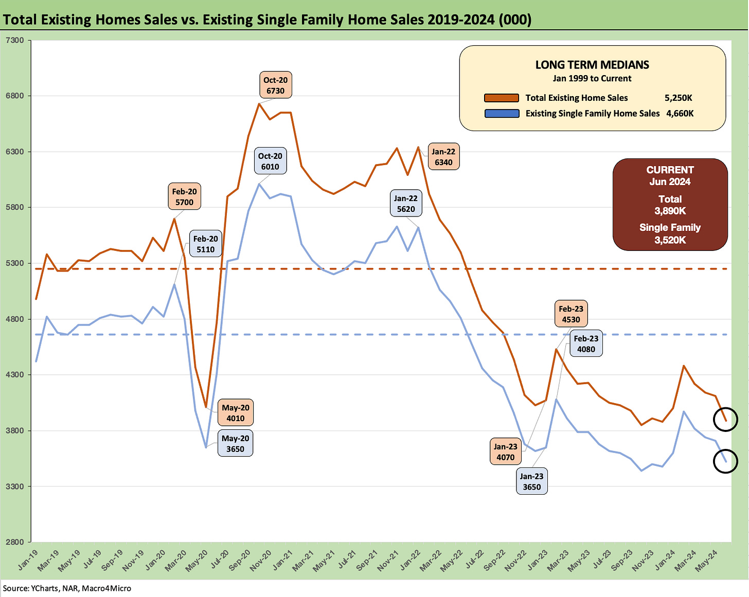 The above chart breaks out the timeline for single family alone vs. total existing home sales of 3.89 million, which is well below the long-term median (from Jan 1999) of 5.25 million. The lower line is ex-condo/ex-co-ops. Total single family ex-condos/co-ops declined sequentially to 3.52 million in June from 3.71 million in May. We saw 380K in condos and co-ops in June, down from 400K in May 2024.
