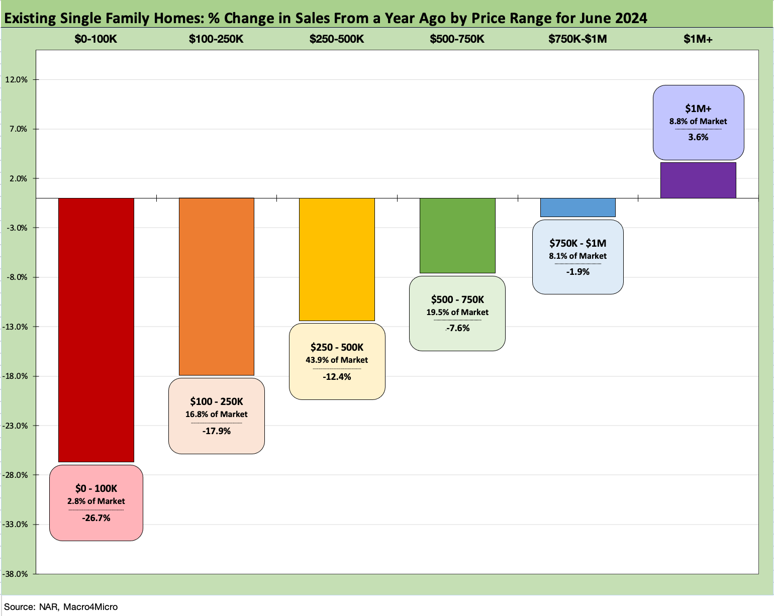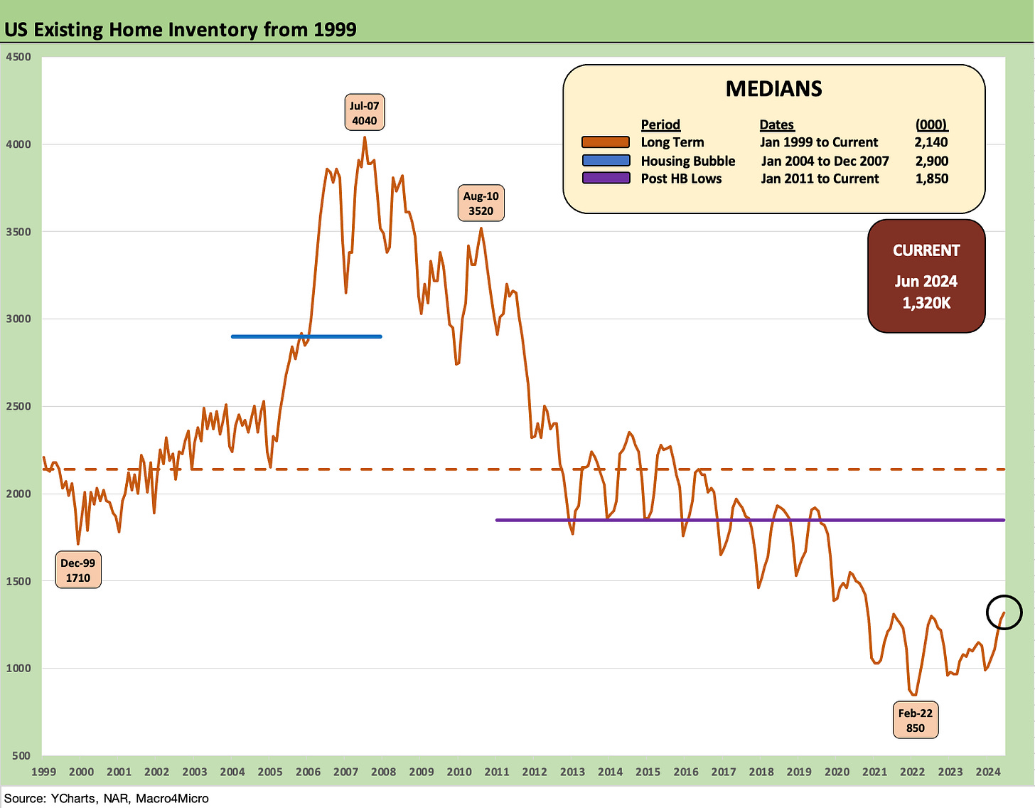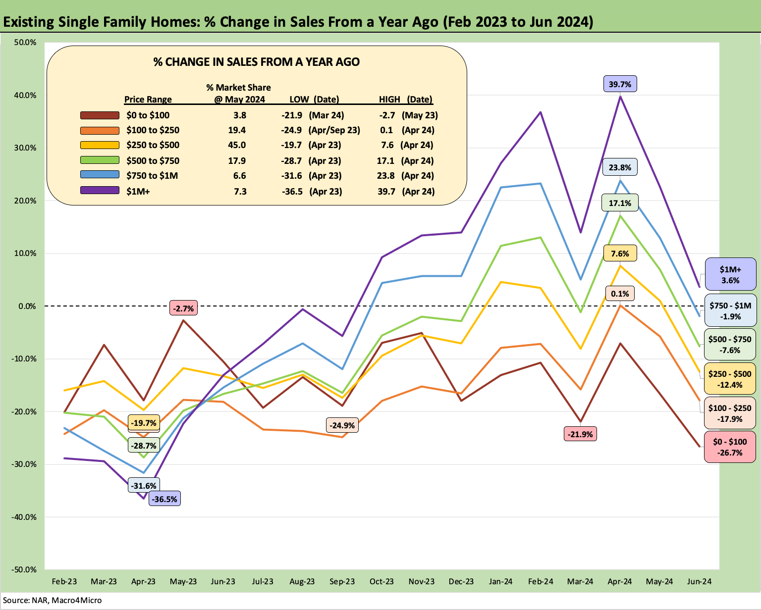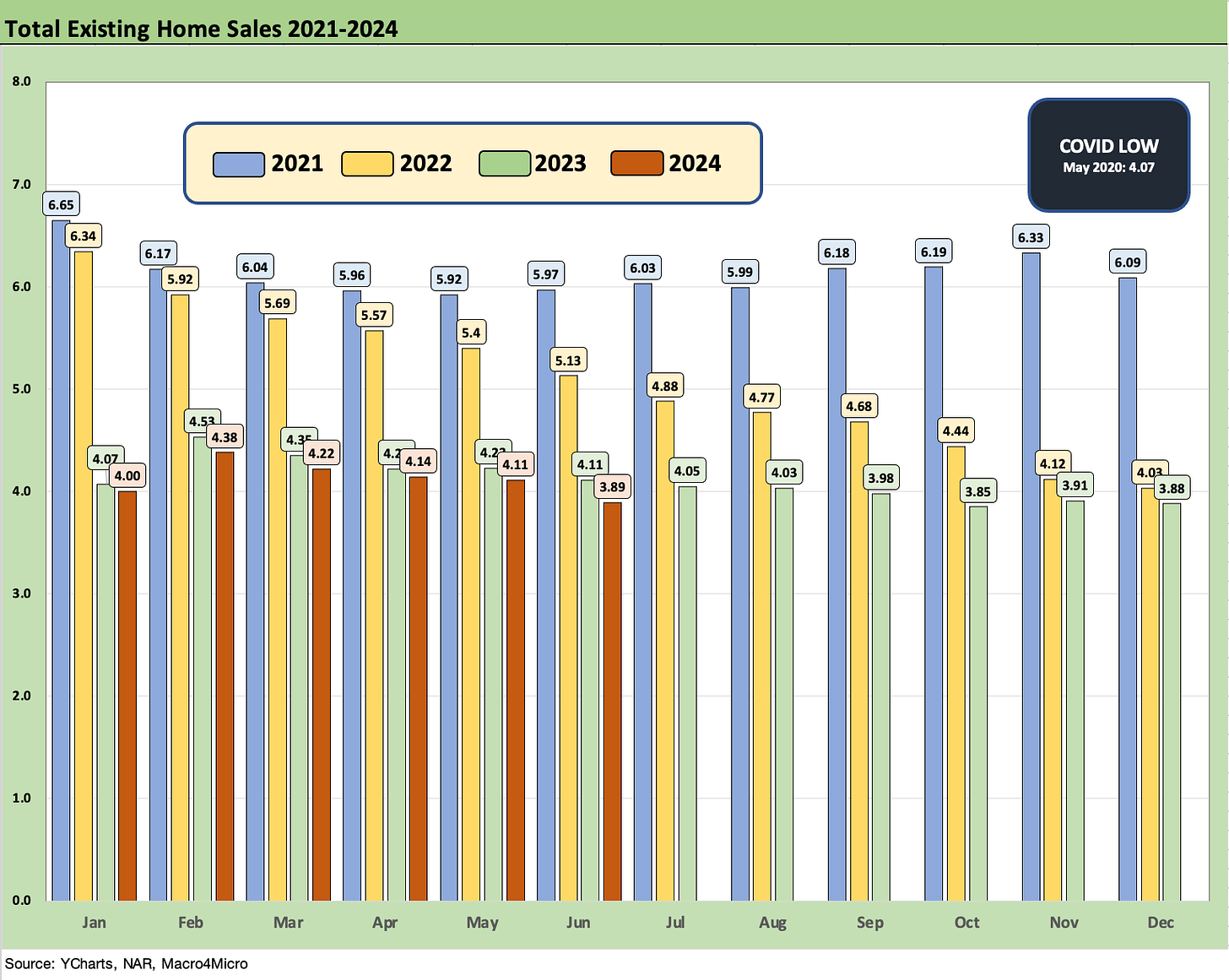 The above chart updates the monthly existing home sales across the timeline from Jan 2021 through June 2024. The market is a long way from the 6 million and high 5 million handles of 2021 and then into early 2022 when many homeowners refinanced, and new buyers locked in low mortgages. ZIRP ended in March 2022 and then the UST migration began (see Footnotes & Flashbacks: State of Yields 7-21-24).