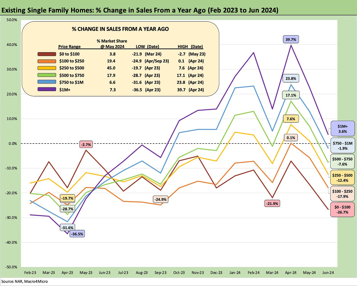 The above two-sided chart updates the pattern of sales volumes for total existing home sales (“EHS”) vs. new single family home sales. The EHS weighed in 3.89 million for June after 4.11 for May 2024 while new single family sales for May was a grim 619K (see New Home Sales: Pumping the Brakes 6-26-24). We will get the updated new single family numbers for June 2024 tomorrow.