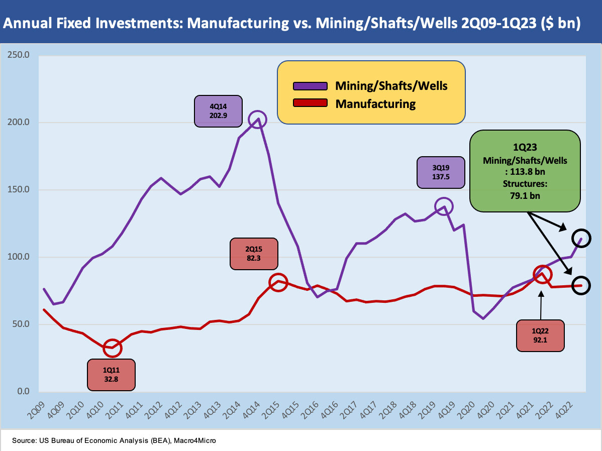 The growth in the total investment in Nonresidential Structures was +37.9% from 2013 to 1Q23 SAAR. That comes with a wide range in the numbers from the +624% in Warehouses down to the -27% in Mining Exploration, Shafts, and Wells. We plot that energy-related time series against Manufacturing in the next chart, and it brings a reminder of what an extraordinary ride it has been on the journey of the US to become the #1 producer in the world of crude oil and liquids and #1 in total crude oil, liquids and natural gas on a BOE basis.