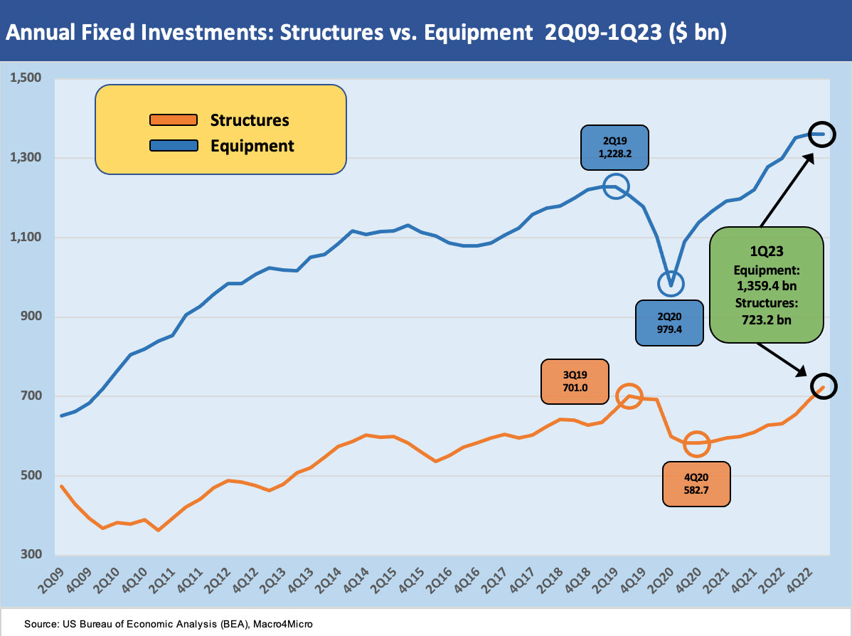 Then COVID drove a macro swoon as so much economic activity hit the brakes. The worry with the 1Q23 numbers is that structures and equipment show a rough history and are notorious for being wildly cyclical as noted in the earlier chart. The half-full side of the current story line is that there are a range of attractive growth areas as we discussed in our GDP comments (see GDP 1Q23: Devils and Details 4-27-23) and Construction note (see Construction Spending: Demystifying Nonresidential Mix 5-9-23).