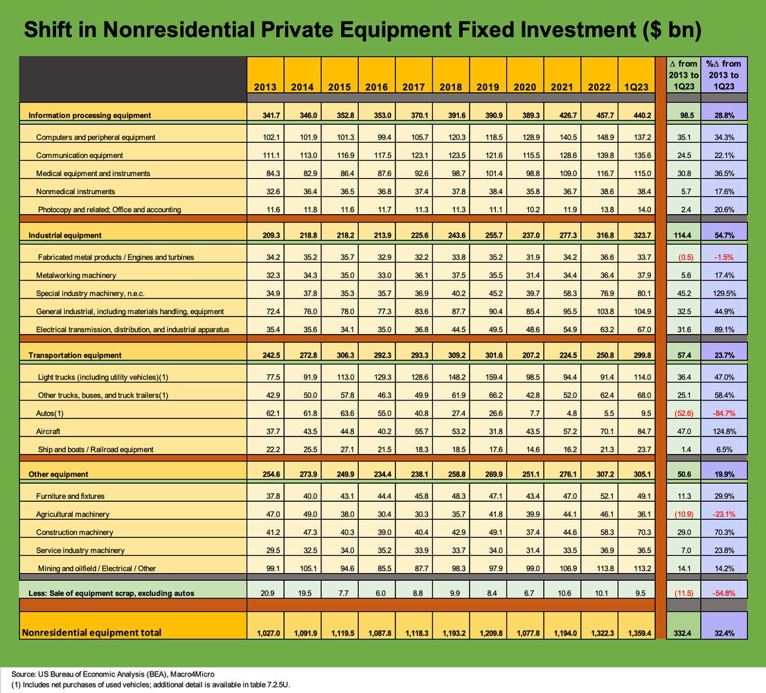 For our last table on the layers under the GDP line items, we break out the categories of Nonresidential Equipment spending by broad sector. The increase since 2013 is almost a one third increase to over $1359 bn. As a reminder, that $1359 billion ties out the Nonresidential Equipment line of the 1Q23 advance GDP release (Line 30 of Table 3). As we indicated at the top, we are just following the trail and looking at the mix underneath the lead numbers.