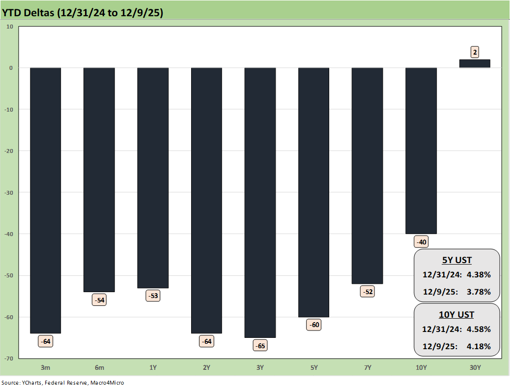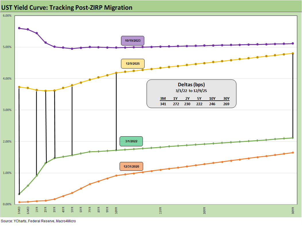 The above chart updates the notable period of shapeshifting for the UST curve since the UST 10Y peak (10-19-23). The period above runs across the FOMC easing that started in Sept 2024 ahead of a bear steepener from Sept 2024 to the current 12-9-25 UST curve. That timeline saw a lot of action from the short end to the long end as we covered in our UST commentaries.