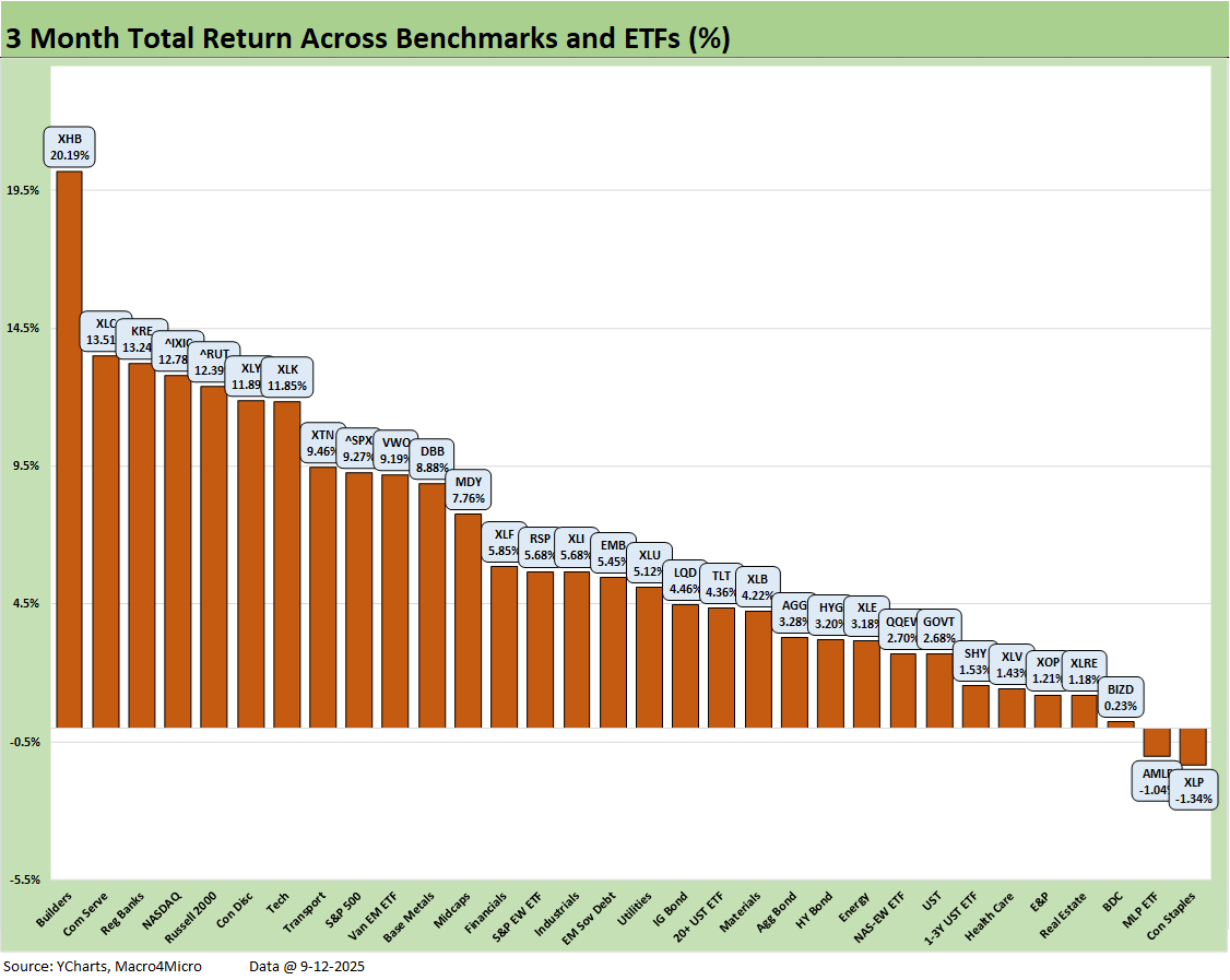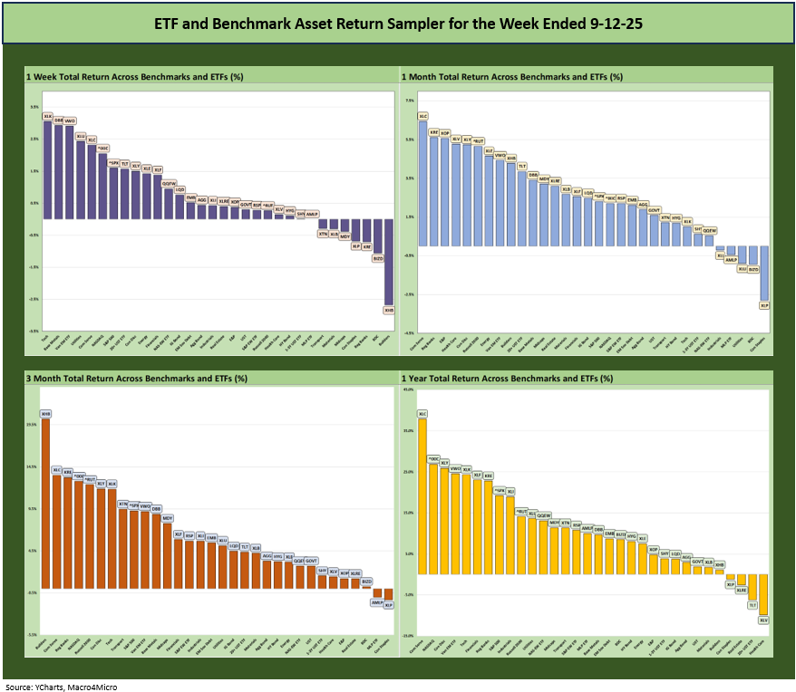 We look at the trailing 1-week returns and the 25-7 score in our Mini Market Lookback: Ugly Week in America, Mild in Markets (9-13-25). While tech did have a strong week as covered in the earlier bellwether chart, we do see some ETFs such as Base Metals (DBB), EM Equities (VWO), and Utilities (XLU) in the top 5. The Tech ETF (XLK) at #1 includes Oracle, Broadcom and NVDIA with their banner week.