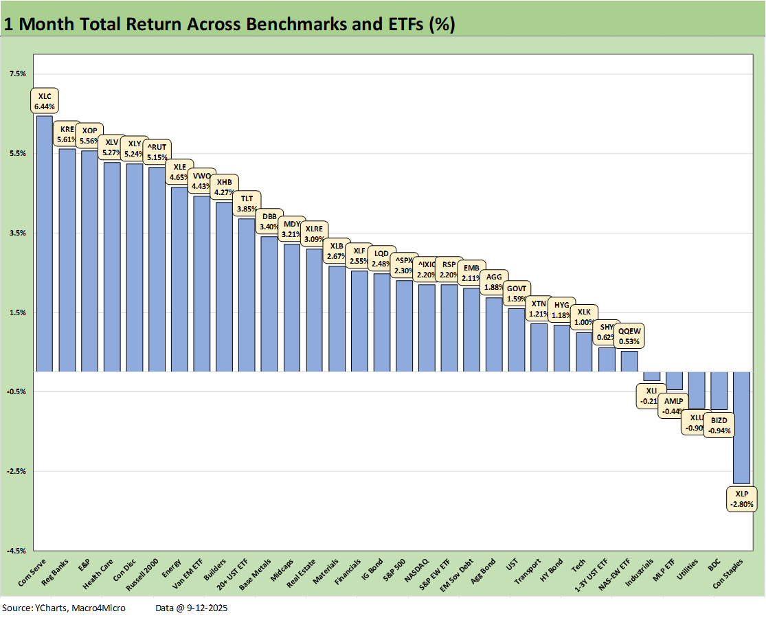 The 1-month score of 27-5 shows a comeback for energy (XLE, XOP) and small cap Russell 2000 with Regional Banks (KRE) at #2 helping small caps. Health Care (XLV) made the top quartile but remains mired in last place LTM and in the bottom quartile YTD. On the low end, we see Industrials (XLI), Midstream Energy (AMLP), Utilities (XLU), BDCs (BIZD) and Consumer Staples (XLP) in the red.