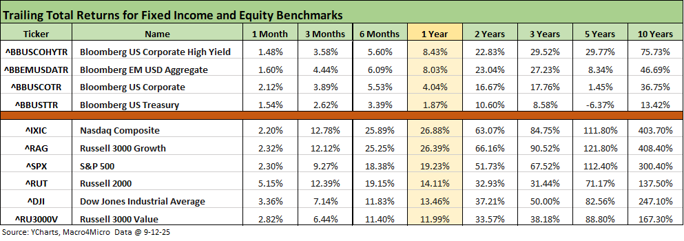 The above table updates the running returns for the high-level benchmarks we watch. We line up the fixed income and equity benchmarks separately in descending order of 1-year total returns.