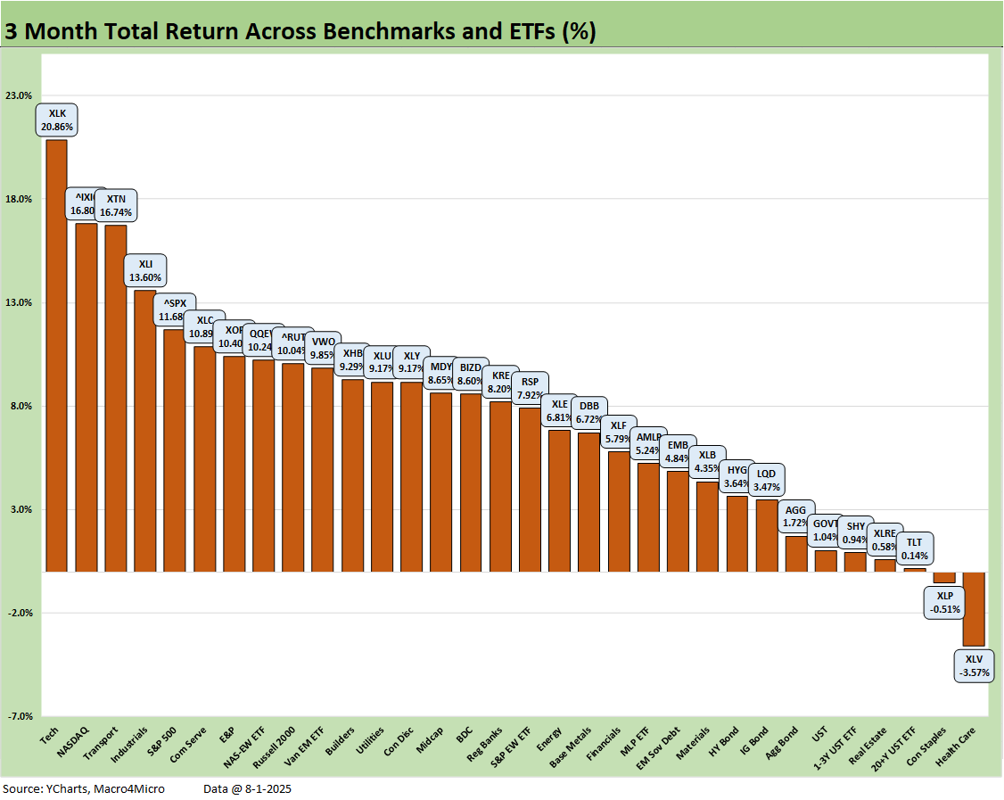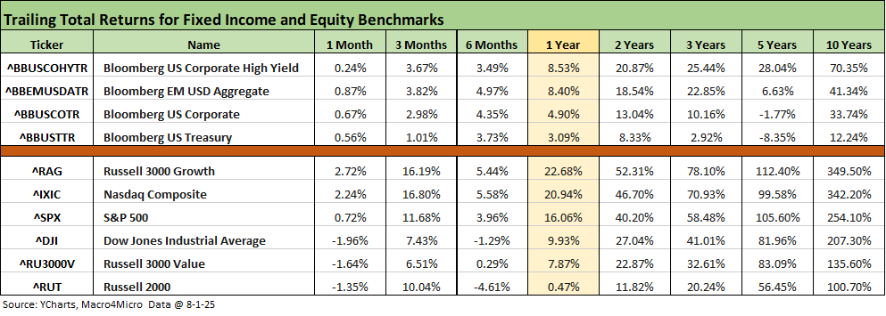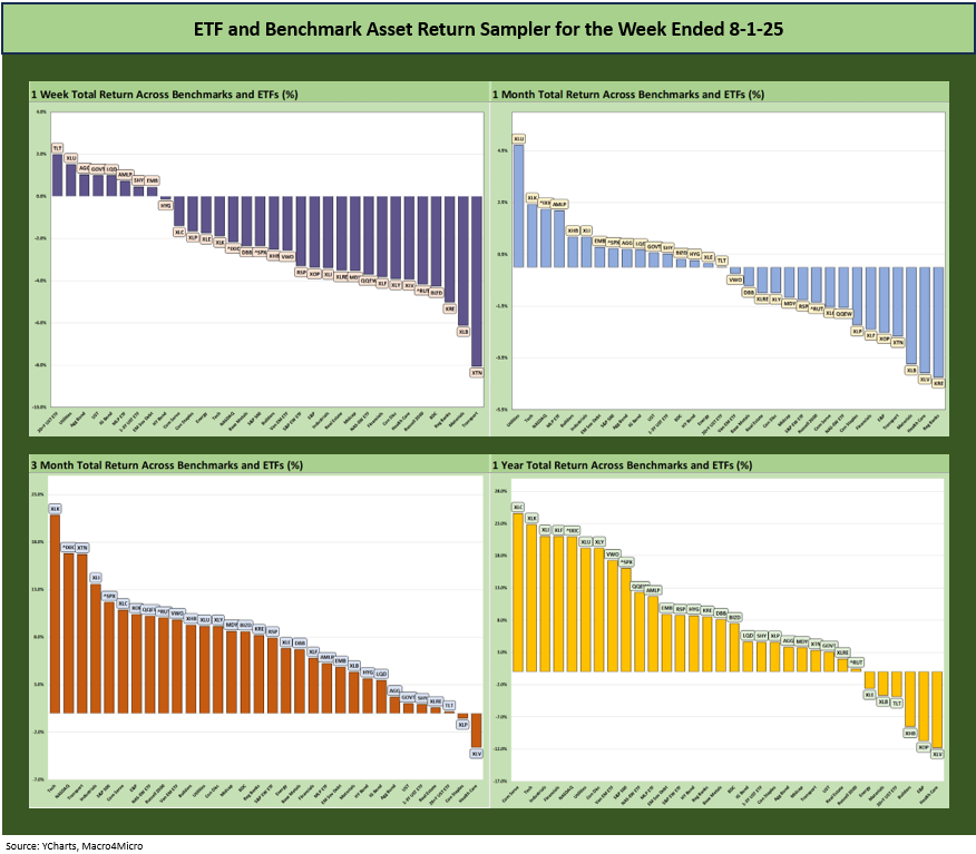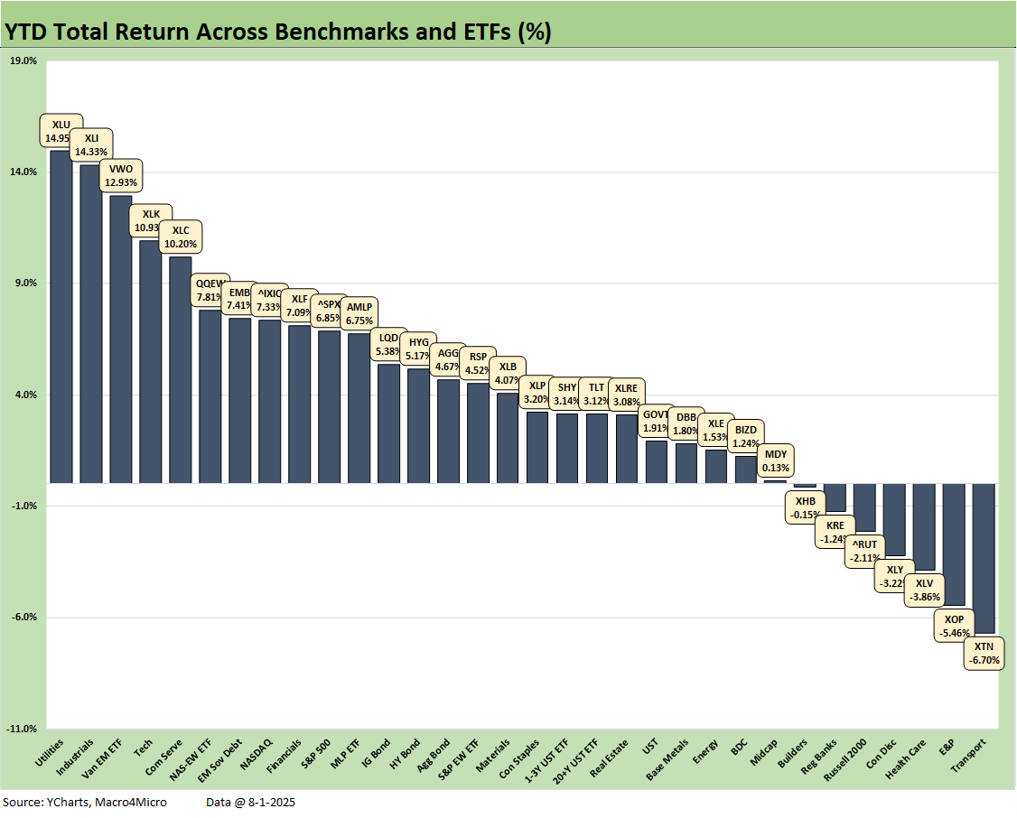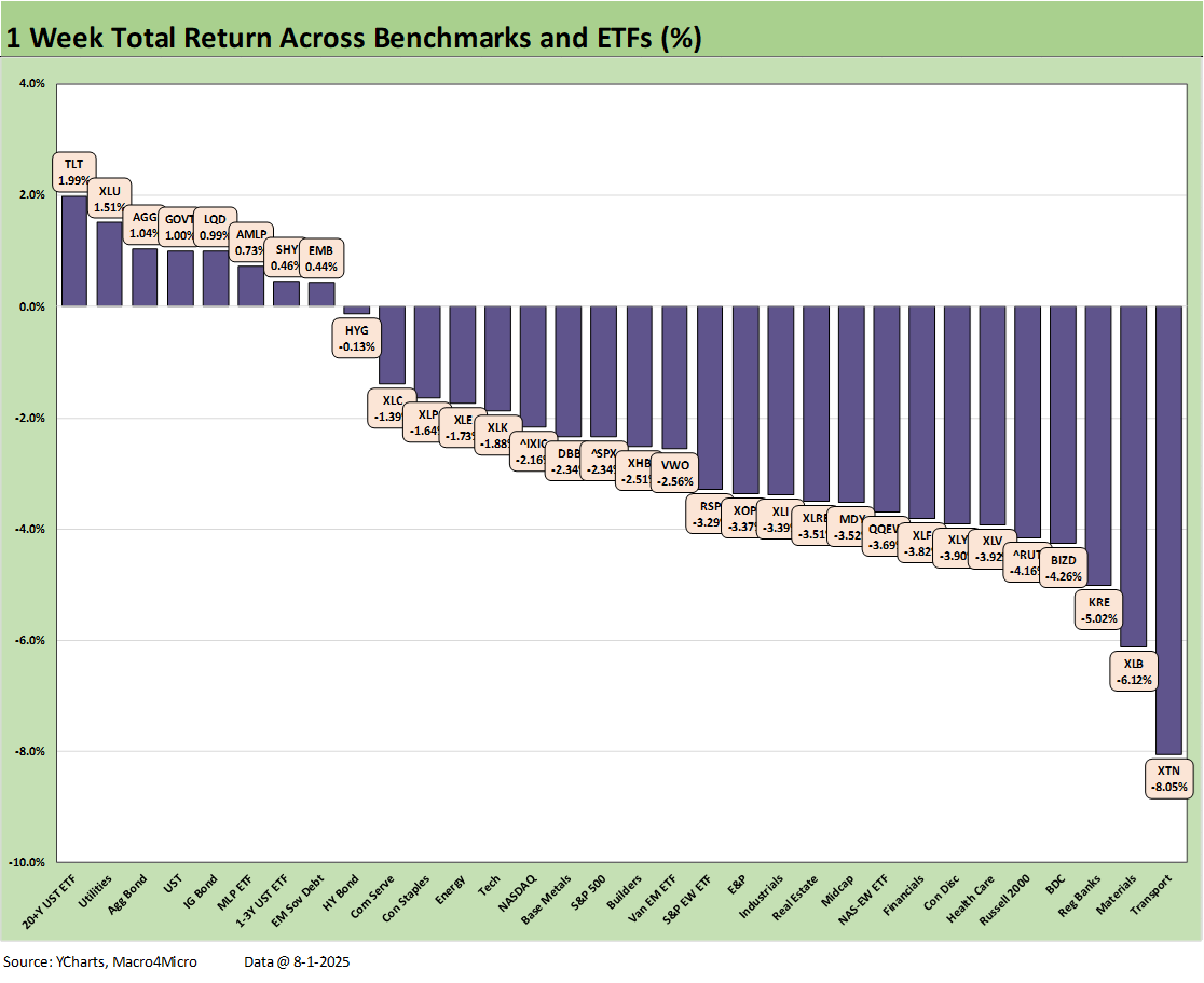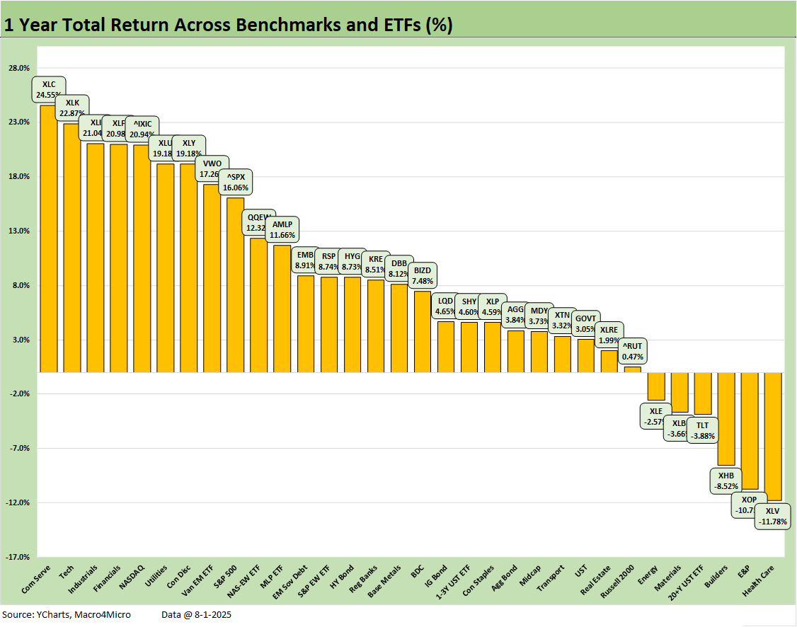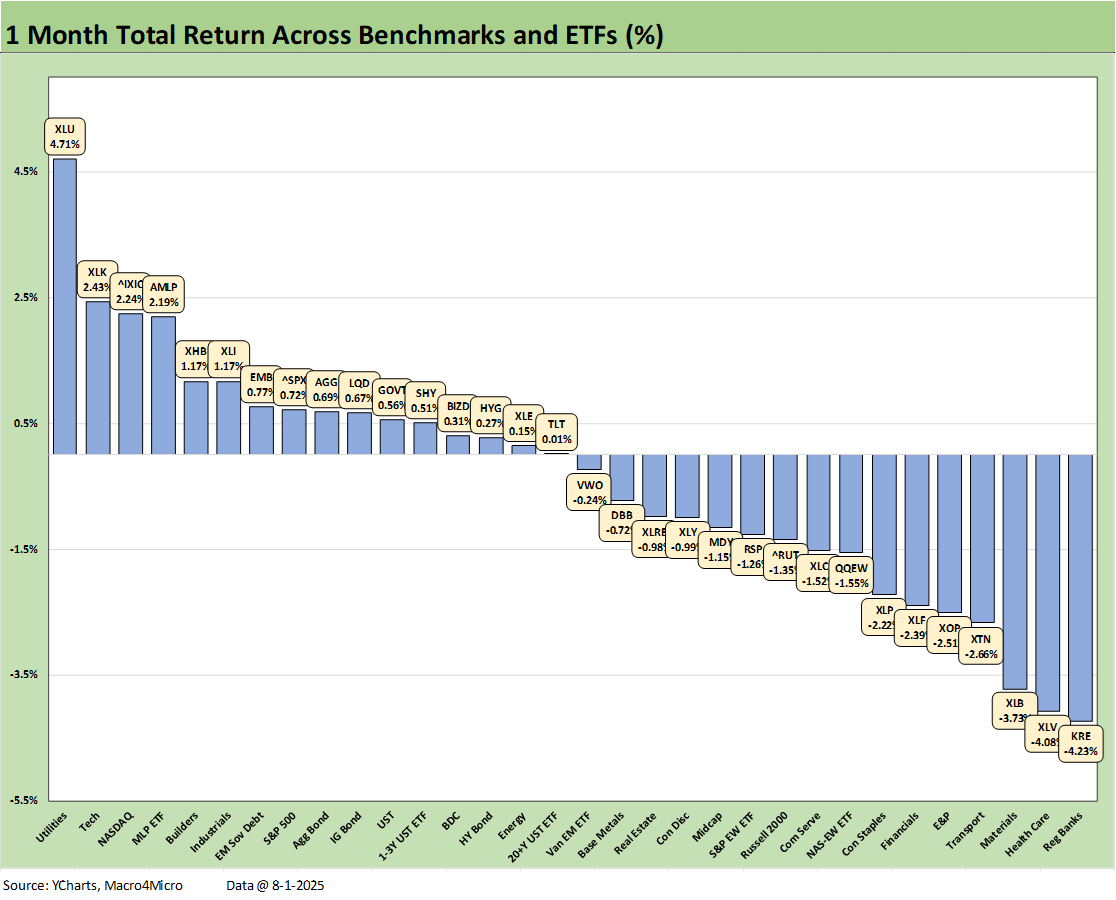 The 1-week returns on the 32 benchmarks and ETFs we track were covered in yesterday’s Mini Market Lookback: Welcome To the New World of Data (8-2-25). The 8-24 positive to negative score included 6 bond ETFs in the 8 positive returns. Among bond ETFs, only HY (HYG) was slightly negative as notable spread widening of +29 bps on the week tipped the scale and more than offset positive UST returns in HY. The Utilities ETF (XLU) and the income-heavy Midstream ETF (AMLP) also made the top quartile.