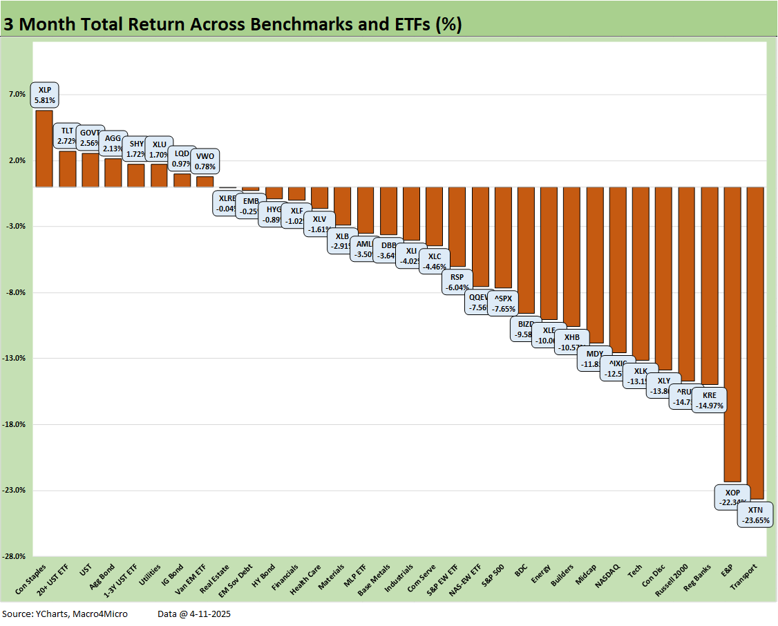 The bottom tier has been pounded over 3-months with the Transport ETF (XTN) at -23.6% on the bottom just ahead of E&P (XOP) at -22.3%. The top of the bottom quartile shows Midcaps (MDY) at -11.8% just ahead of the NASDAQ at -12.5% with small caps Russell 2000 (RUT) a few more notches below at -14.7%. Those 3 indexes in double-digit negative range in the bottom tier shows the breadth of concern. The remaining members of the bottom tier include the Tech ETF (XLK), Regional Banks (KRE), and Consumer Discretionary (XLY) with its Tesla and Amazon exposure. That mix underscores the range of the pain across diverse industry groups.