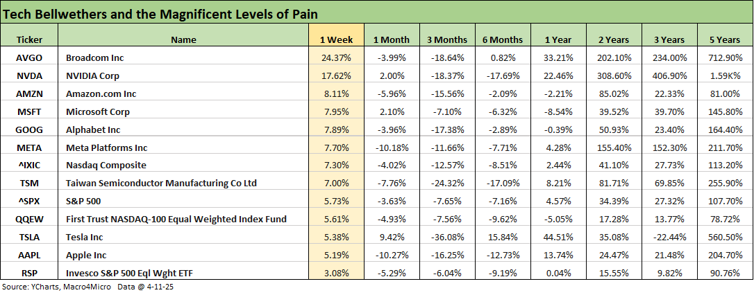 We already reviewed the tech bellwethers in Mini Market Lookback: Trade’s Big Bang (4-12-25). A great week does not negate the ugly month and 3-months. The latest exemptions issued Friday night by Team Trump that hit the screen on Saturday should offer some more relief in tech.
