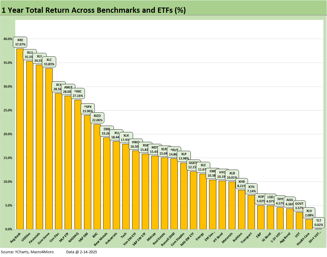 Given the dominance of tech stories the past year, it is notable that the top 3 performers are outside tech with Regional Banks (KRE) at #1, Utilities (XLU) at #2, and Financials (XLF) at #3 before the tech and Mag 7 heavy lineup with Communications Services (XLC), Consumer Discretionary (XLY), NASDAQ, and the S&P 500.